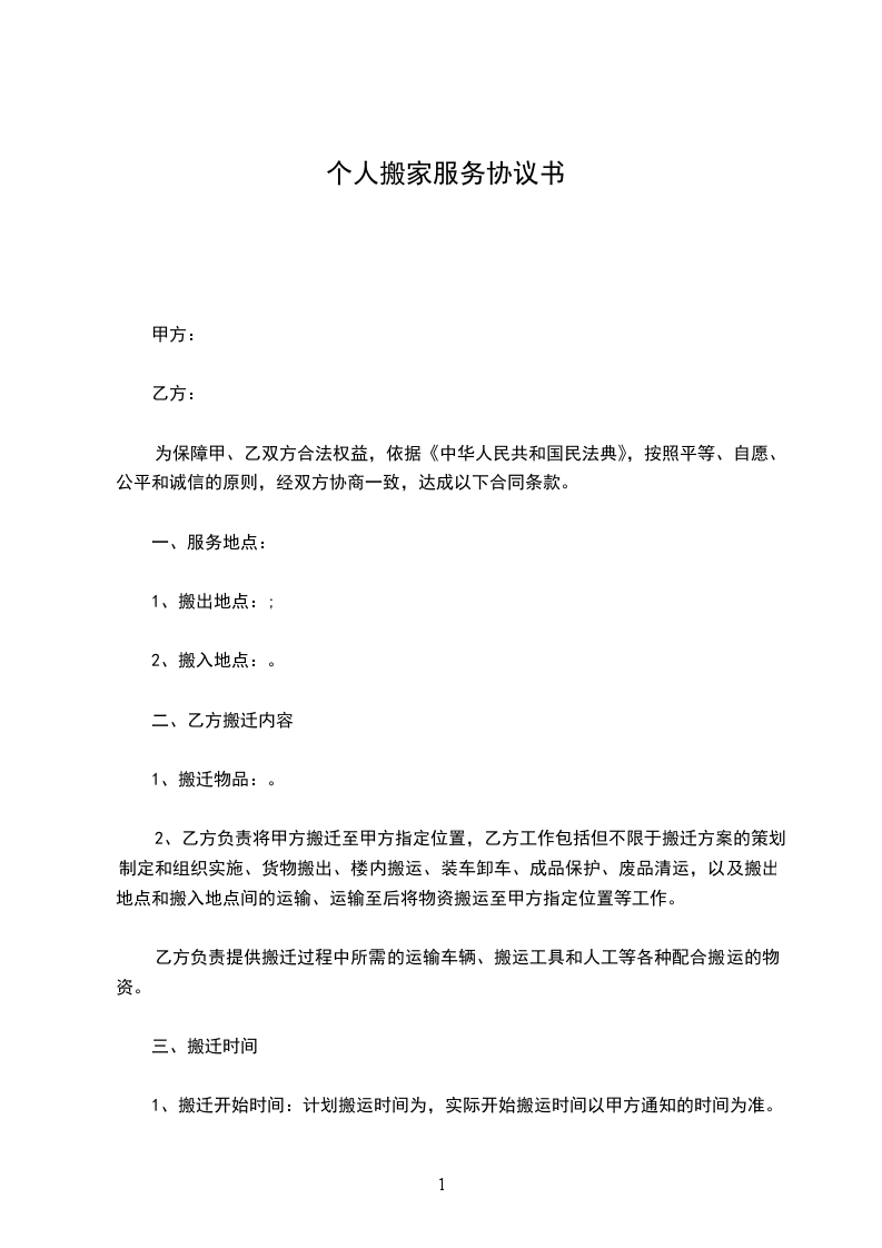 2、搬迁完成时间:搬运完成期限为个日历天,乙方应当在以上期限内完成全部物品的搬迁。