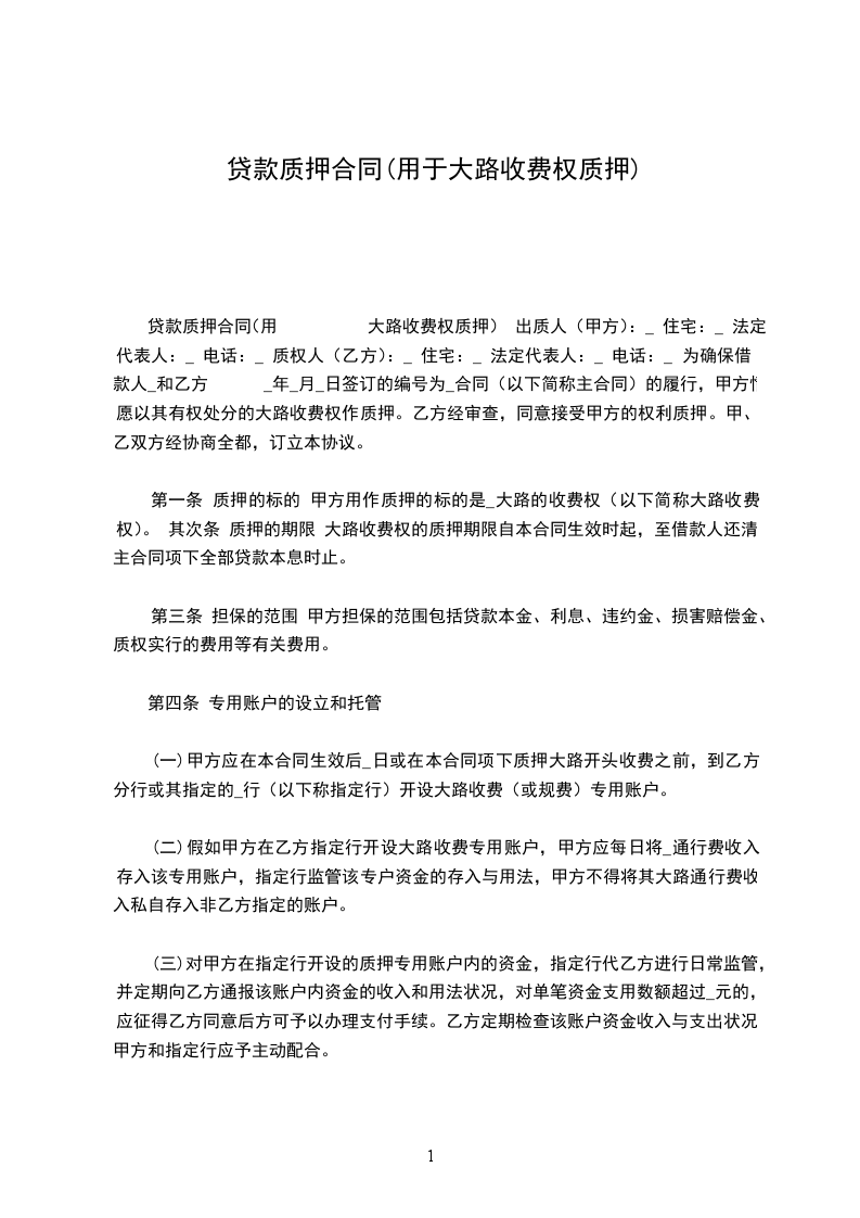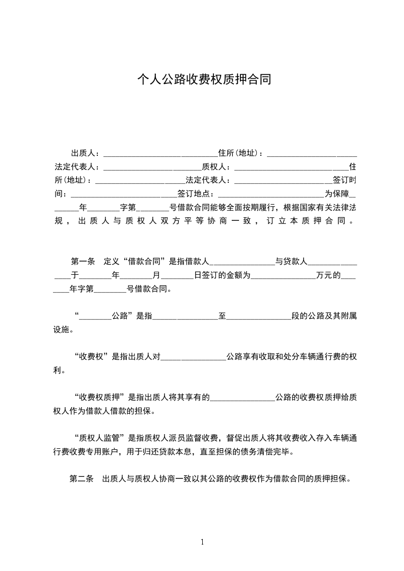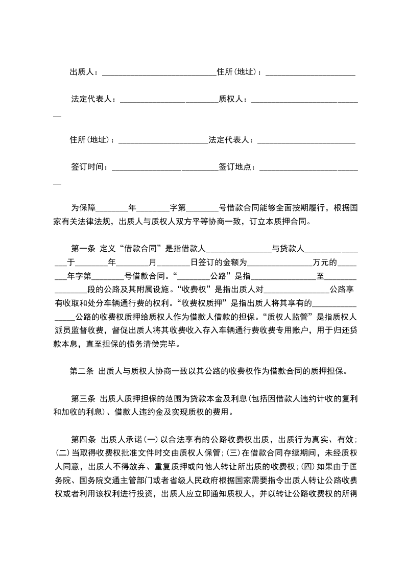 第一条 定义“借款合同”是指借款人________________与贷款人________________于________年________月________日签订的金额为________________万元的________年字第________号借款合同。“________公路”是指________________至________________段的公路及其附属设施。“收费权”是指出质人对________________公路享有收取和处分车辆通行费的权利。“收费权质押”是指出质人将其享有的________________公路的收费权质押给质权人作为借款人借款的担保。“质权人监管”是指质权人派员监督收费,督促出质人将其收费收入存入车辆通行费收费专用账户,用于归还贷款本息,直至担保的债务清偿完毕。