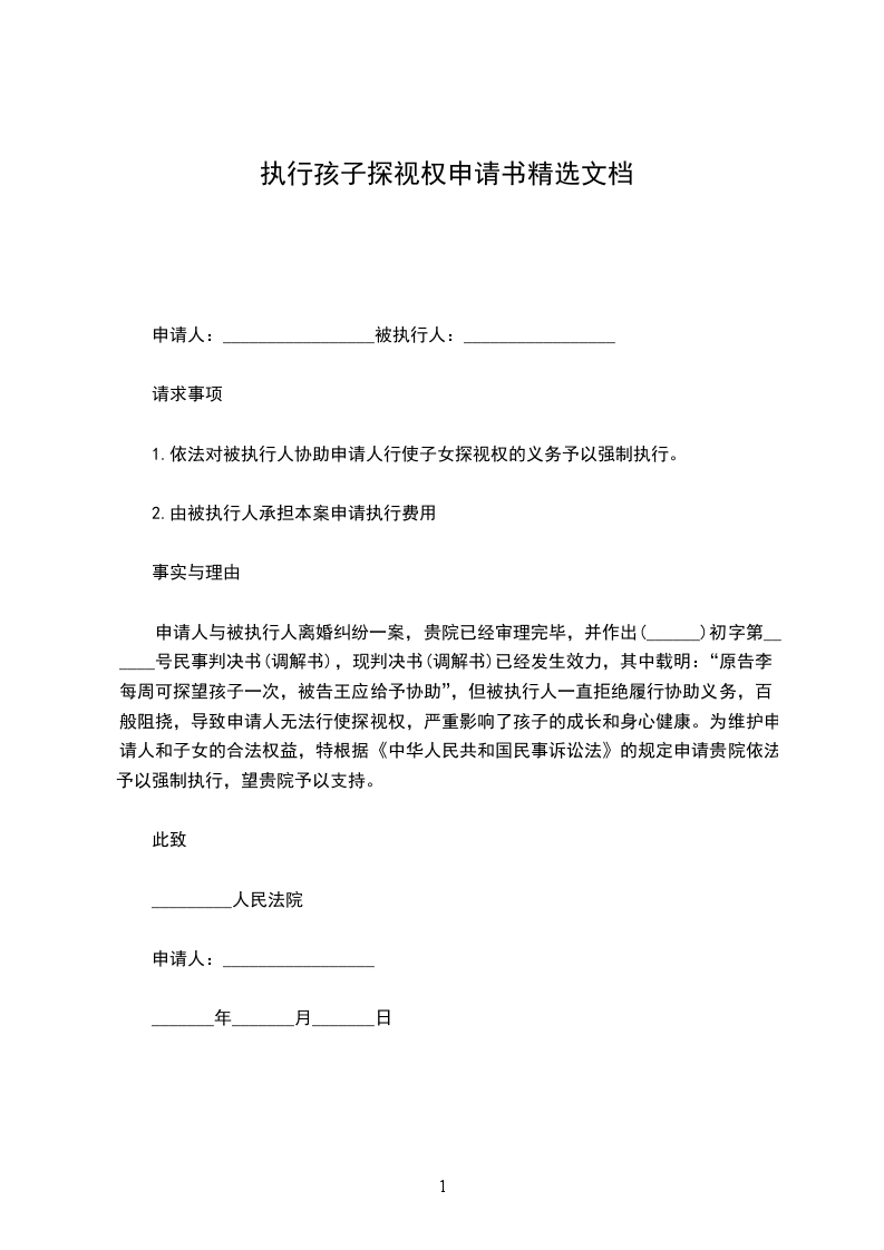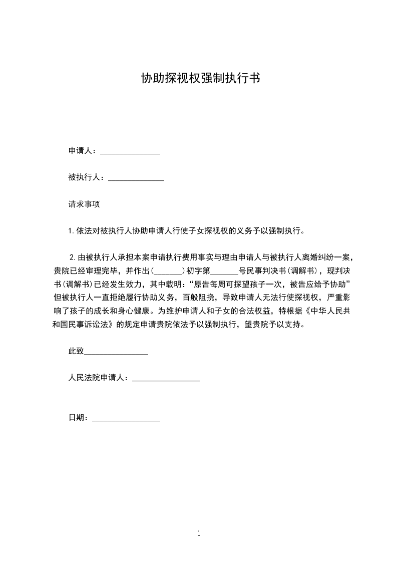 申请人:_______________被执行人:_______________请求事项1.依法对被执行人协助申请人行使子女探视权的义务予以强制执行。2.由被执行人承担本案申请执行费用事实与理由申请人与被执行人离婚纠纷一案,贵院已经审理完毕,并作出(_______)初字第_______号民事判决书(调解书),现判决书(调解书)已经发生效力,其中载明:“原告每周可探望孩子一次,被告应给予协助”,但被执行人一直拒绝履行协助义务,百般阻挠,导致申请人无法行使探视权,严重影响了孩子的成长和身心健康。为维护申请人和子女的合法权益,特根据《中华人民共和国民事诉讼法》的规定申请贵院依法予以强制执行,望贵院予以支持。