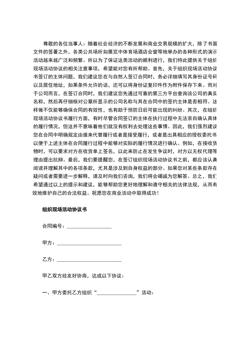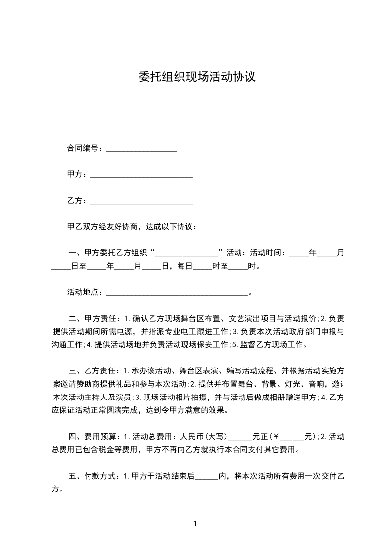 一、甲方委托乙方组织“________________”活动:活动时间:_____年_____月_____日至_____年_____月_____日,每日_____时至_____时。