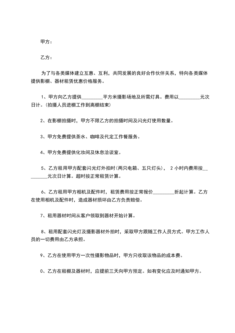 根据《中华人民共和国民法典》及相关法律法规的规定,甲乙双方在平等、自愿、公平、诚实信用的基础上,就乙方向甲方租赁影棚器材事宜,达成如下协议:
