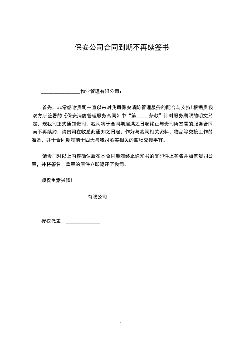 首先,非常感谢贵司一直以来对我司保安消防管理服务的配合与支持!根据贵我双方所签署的《保安消防管理服务合同》中“第_____条款”针对服务期限的明文约定,现我司正式通知贵司,我司将于合同期届满之日起终止与贵司所签署的服务合同而不再续约,请贵司在收悉此通知之日起,作好与我司相关资料、物品等交接工作的准备,并于合同期满前十四天与我司落实相关的撤场交接事宜。