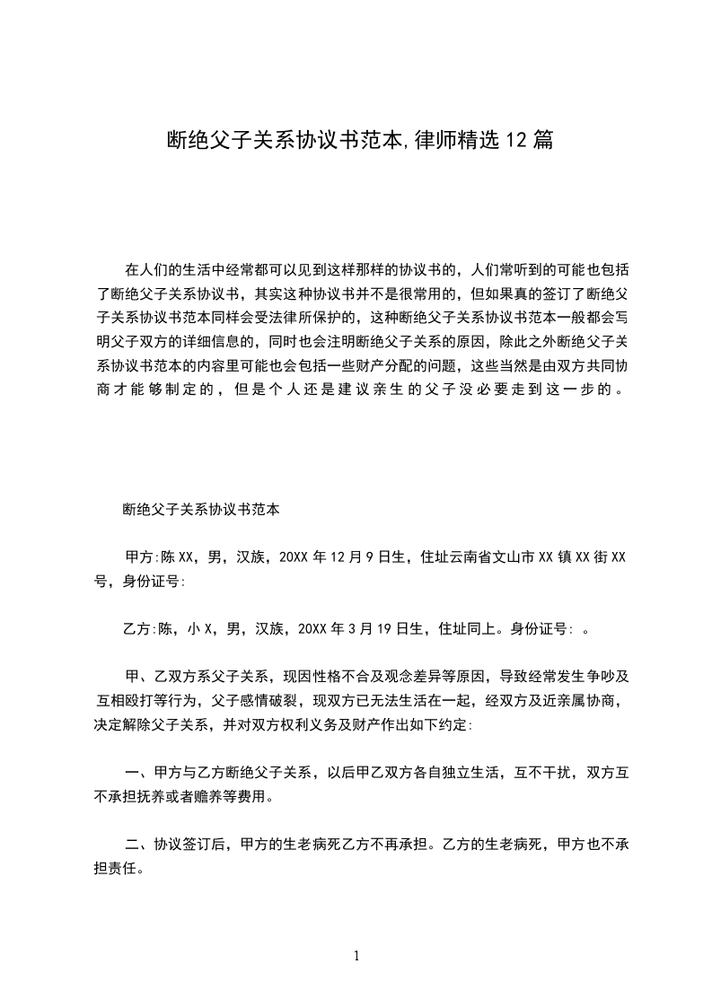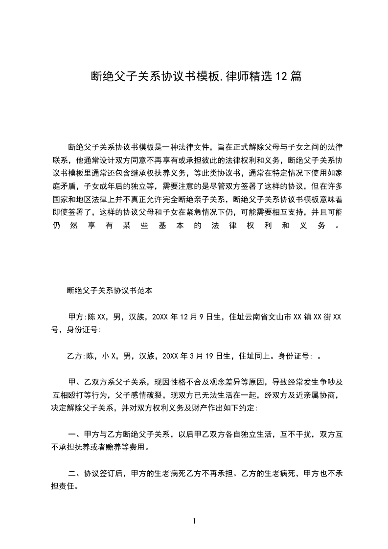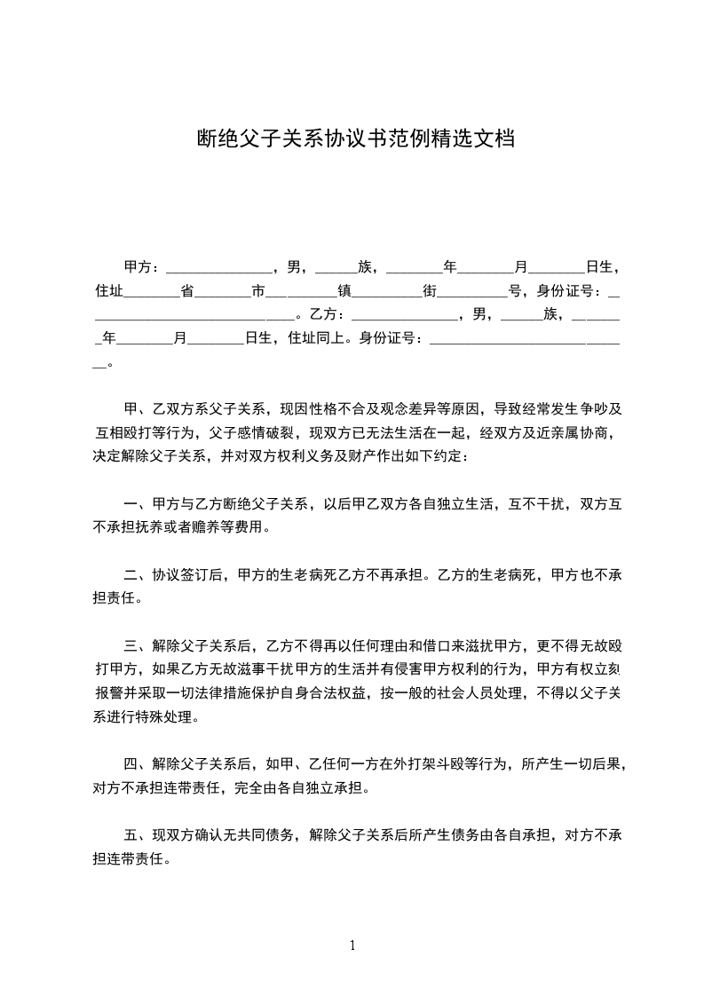1. 本协议生效后,双方不再以父子关系的名义参与对方的家庭事务、社会活动或享有相关权益。双方对外均需声明已断绝父子关系,不得向第三方宣称仍保持父子关系。