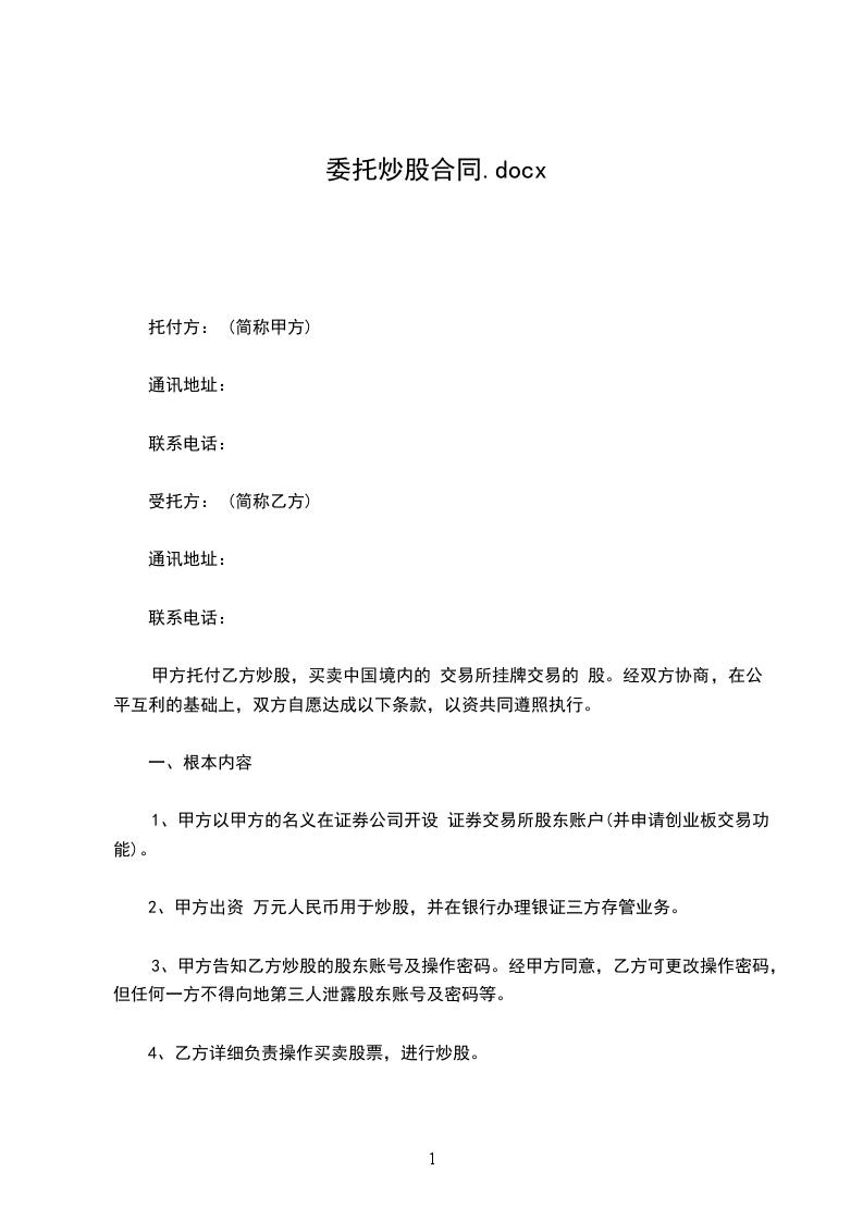 鉴于甲方希望委托乙方进行股票投资操作,乙方具备相关专业知识和经验,双方经友好协商,达成以下委托炒股合同: