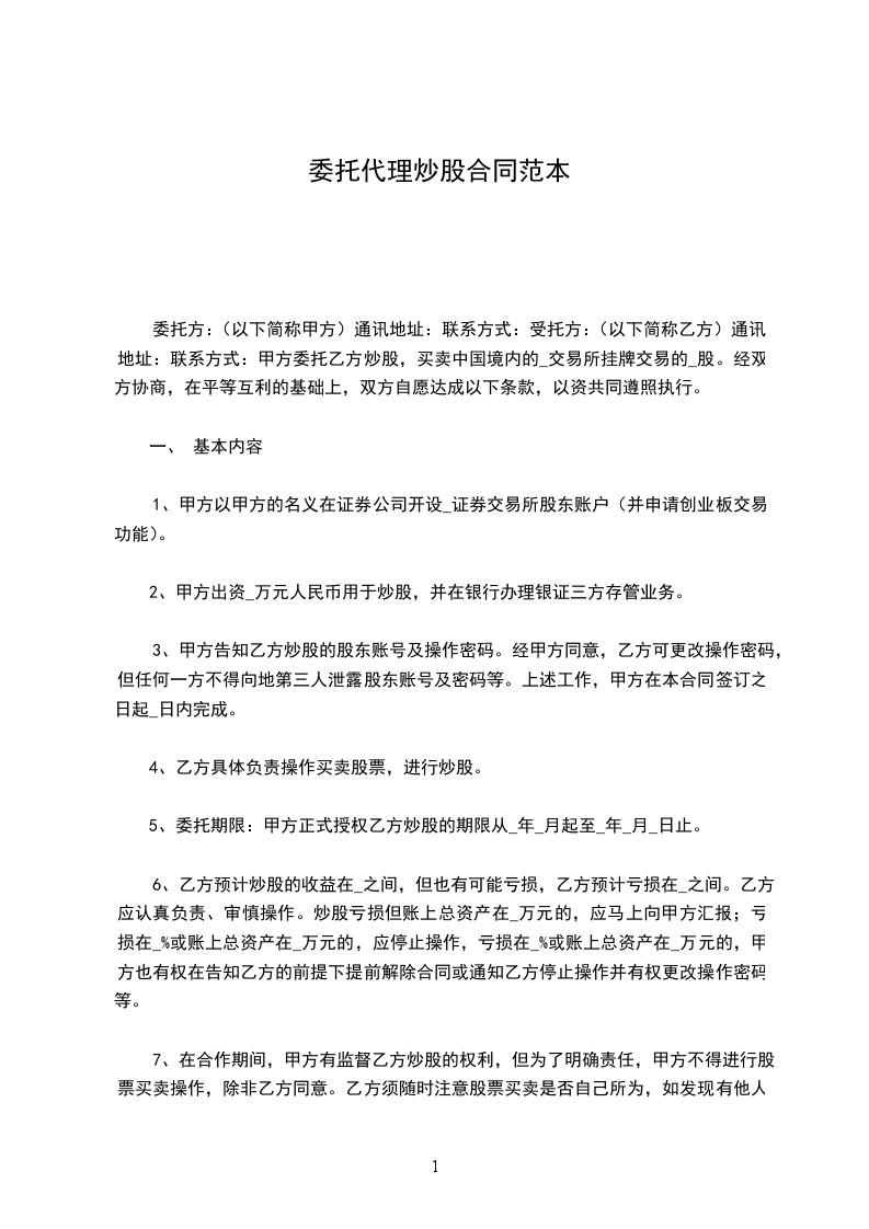 1. 甲方委托乙方代理操作甲方名下的资金账户(账户信息:__________________),用于股票投资。