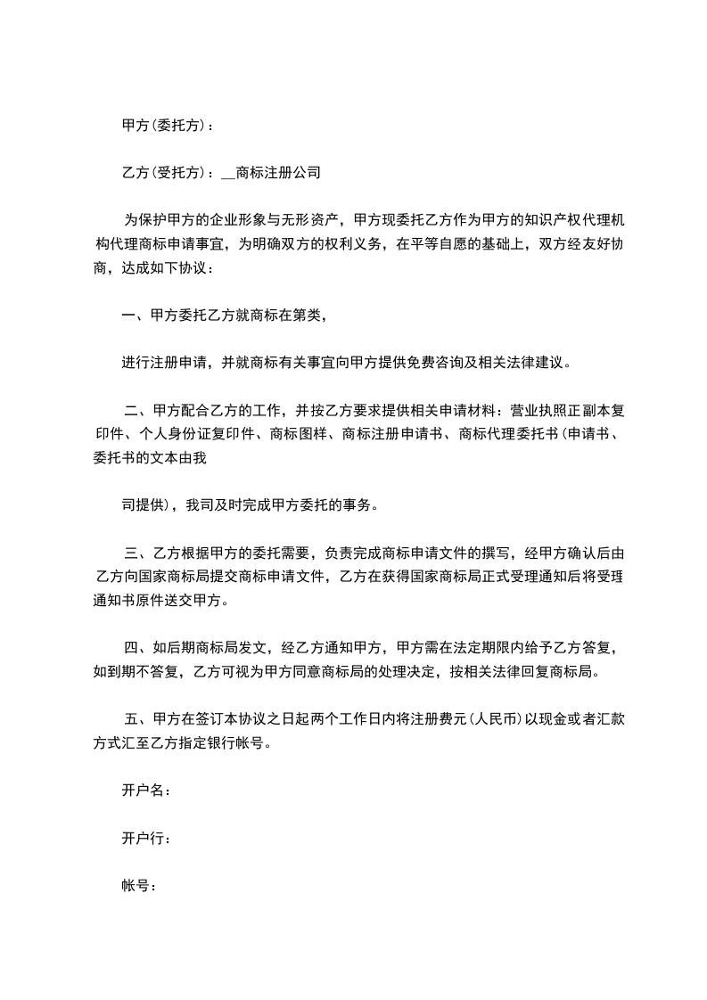 为保护甲方的企业形象与无形资产,甲方现委托乙方作为甲方的知识产权代理机构代理商标申请事宜,为明确双方的权利义务,在平等自愿的基础上,双方经友好协商,达成如下协议:
