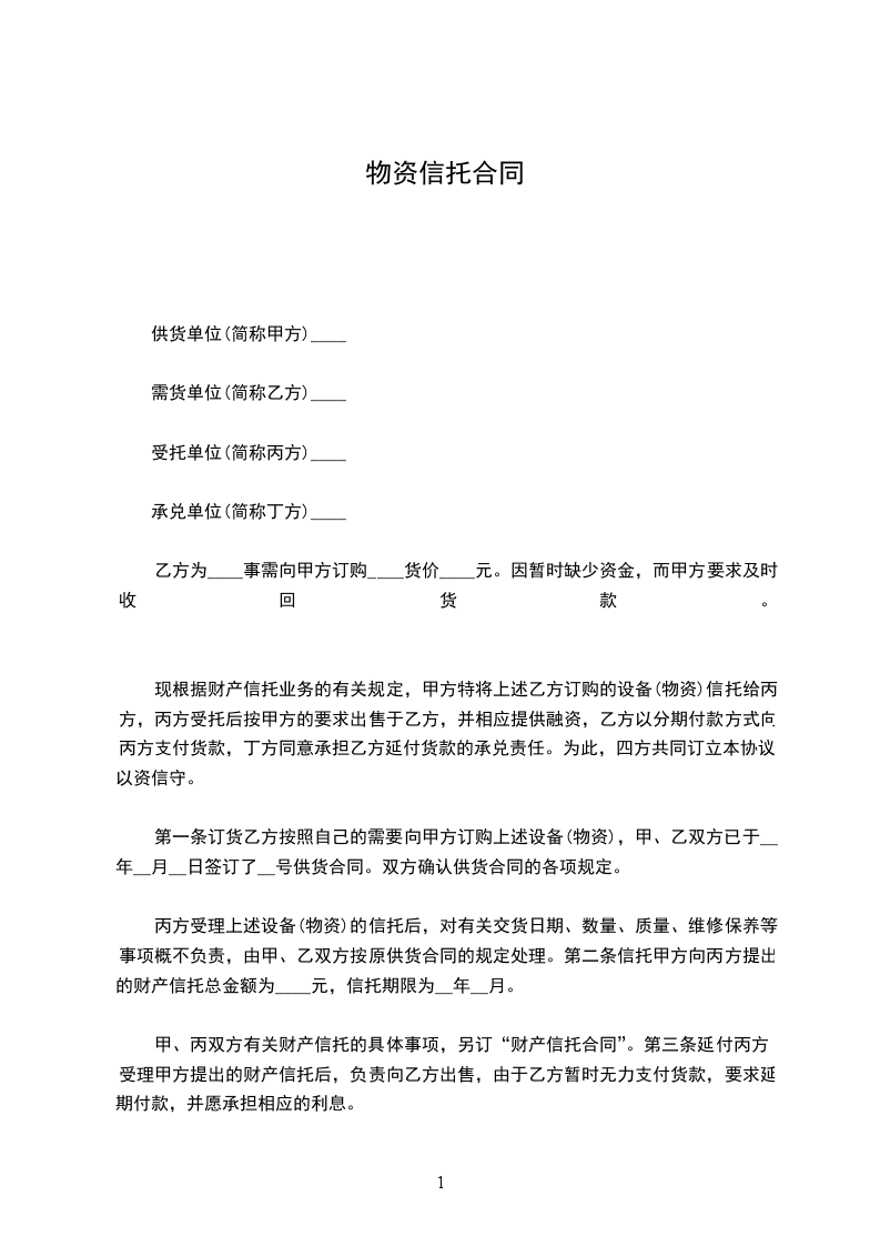 现根据财产信托业务的有关规定,甲方特将上述乙方订购的设备(物资)信托给丙方,丙方受托后按甲方的要求出售于乙方,并相应提供融资,乙方以分期付款方式向丙方支付货款,丁方同意承担乙方延付货款的承兑责任。为此,四方共同订立本协议,以资信守。