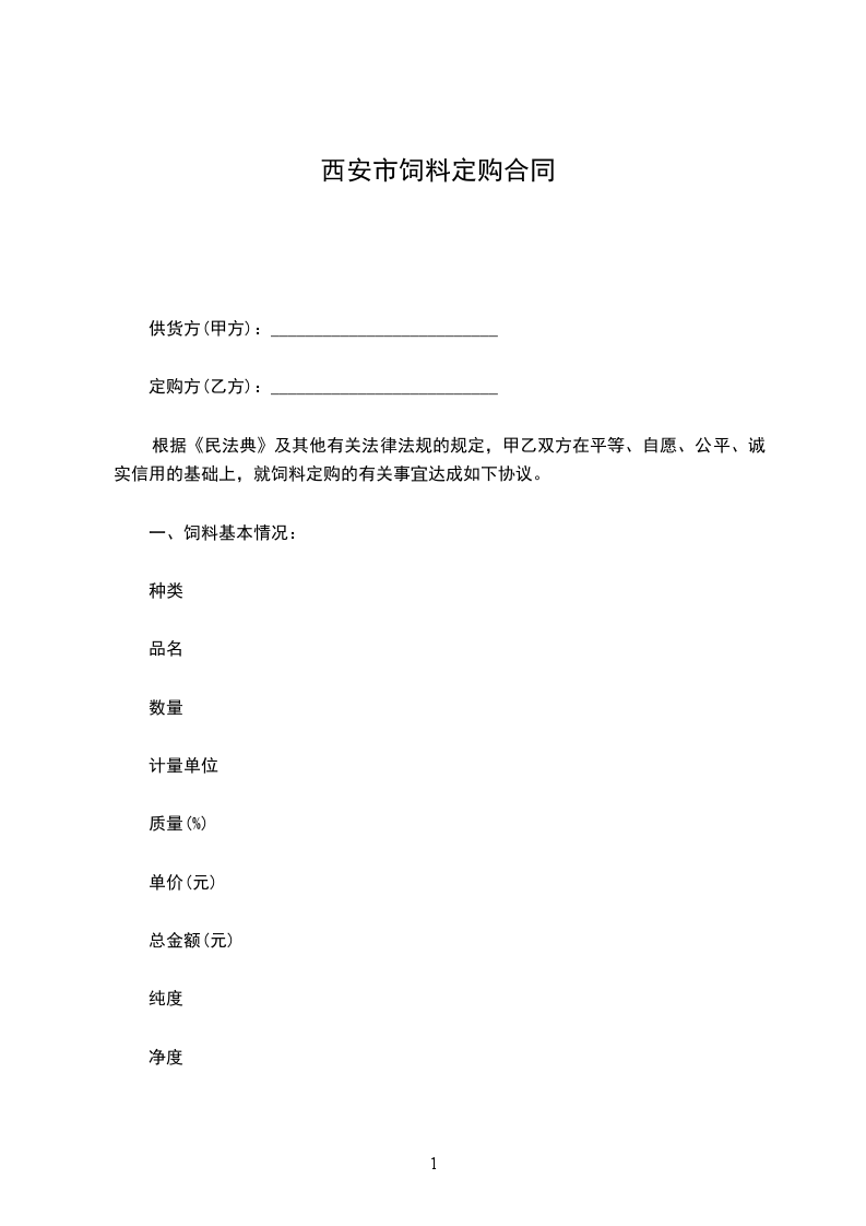 根据《民法典》及其他有关法律法规的规定,甲乙双方在平等、自愿、公平、诚实信用的基础上,就饲料定购的有关事宜达成如下协议。