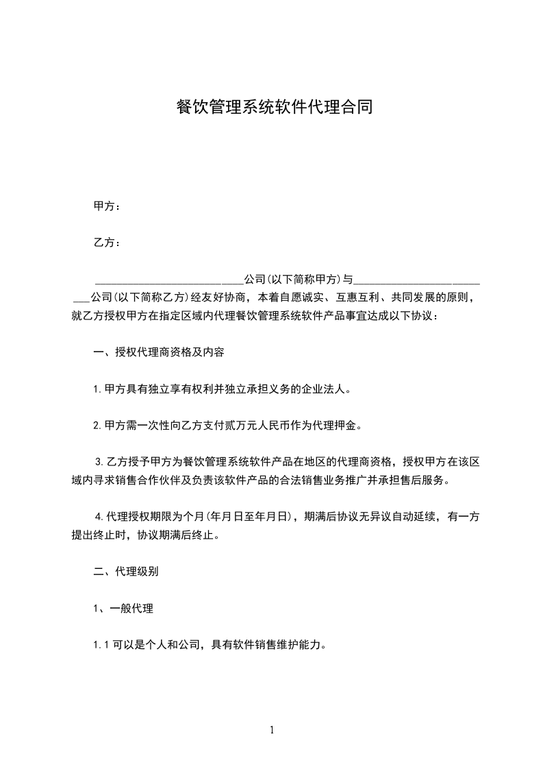 ___________________________公司(以下简称甲方)与__________________________公司(以下简称乙方)经友好协商,本着自愿诚实、互惠互利、共同发展的原则,就乙方授权甲方在指定区域内代理餐饮管理系统软件产品事宜达成以下协议: