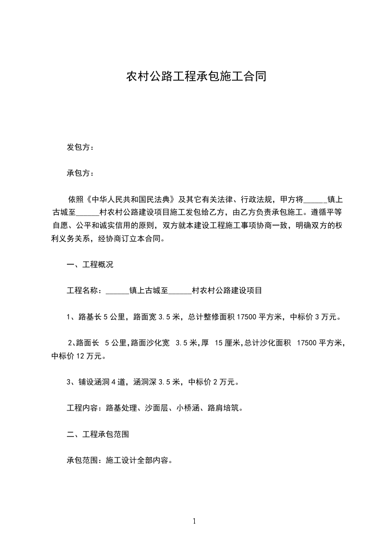 依照《中华人民共和国民法典》及其它有关法律、行政法规,甲方将______镇上古城至______村农村公路建设项目施工发包给乙方,由乙方负责承包施工。遵循平等、自愿、公平和诚实信用的原则,双方就本建设工程施工事项协商一致,明确双方的权利义务关系,经协商订立本合同。