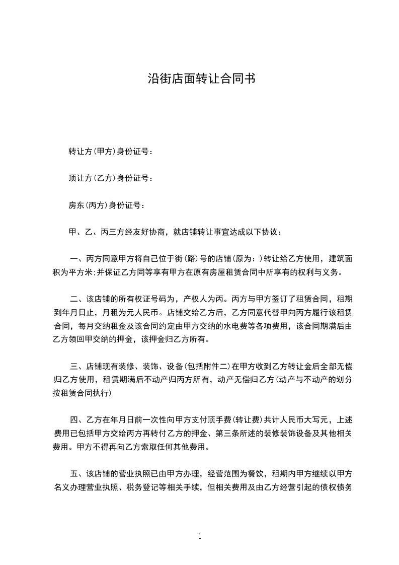 一、丙方同意甲方将自己位于街(路)号的店铺(原为:)转让给乙方使用,建筑面积为_____平方米;并保证乙方同等享有甲方在原有房屋租赁合同中所享有的权利与义务。