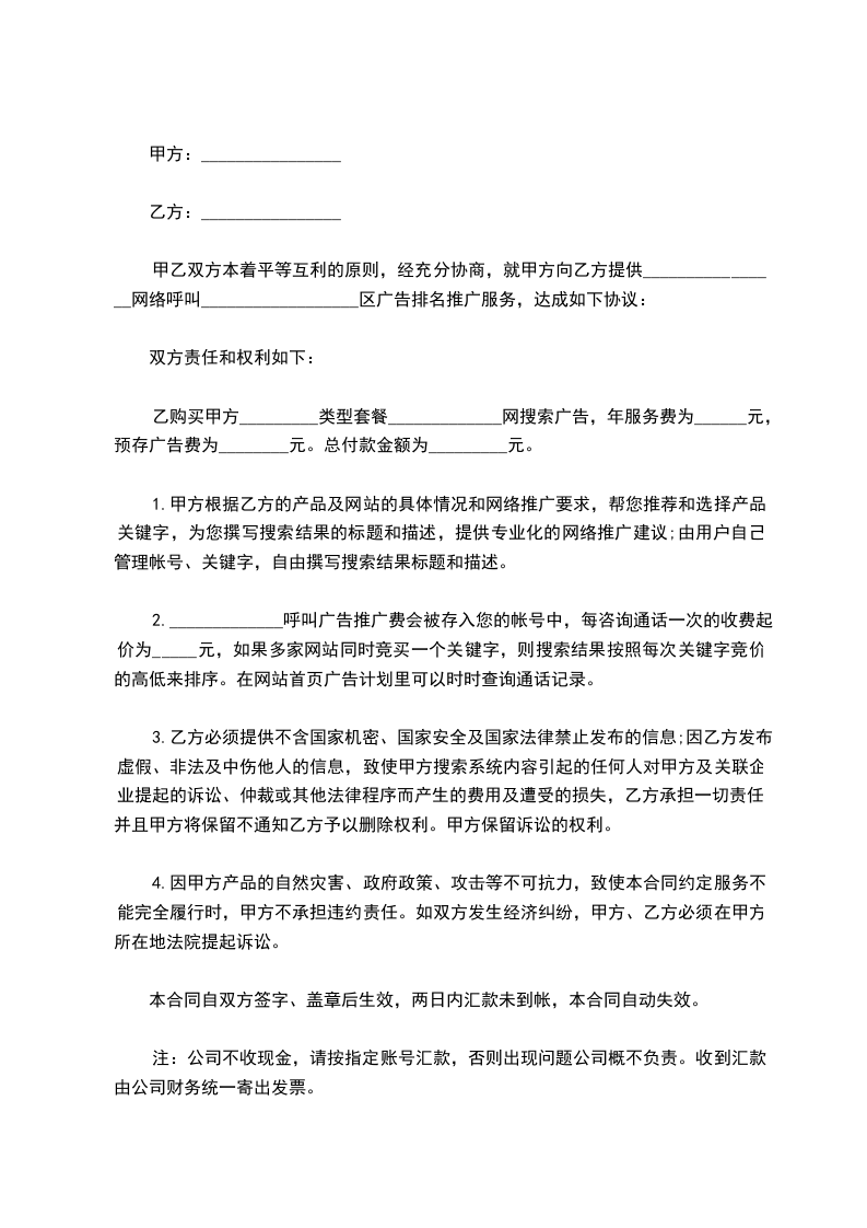 本合作所需广告宣传费用为人民币_________元(_________元整)。包括网站BOTTON,设计.制作.维护及报纸媒体的广告发布费用。