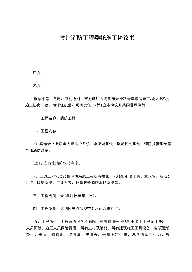 根据平等、自愿、互利原则,双方就甲方将乌市天池路号宾馆消防工程委托乙方施工协商一致,为保证质量、明确责任,特订立本协议并共同遵照执行。