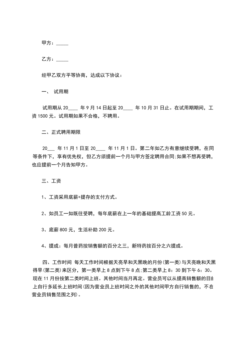四、工作报酬:甲方应付给乙方工作报酬每月___元。