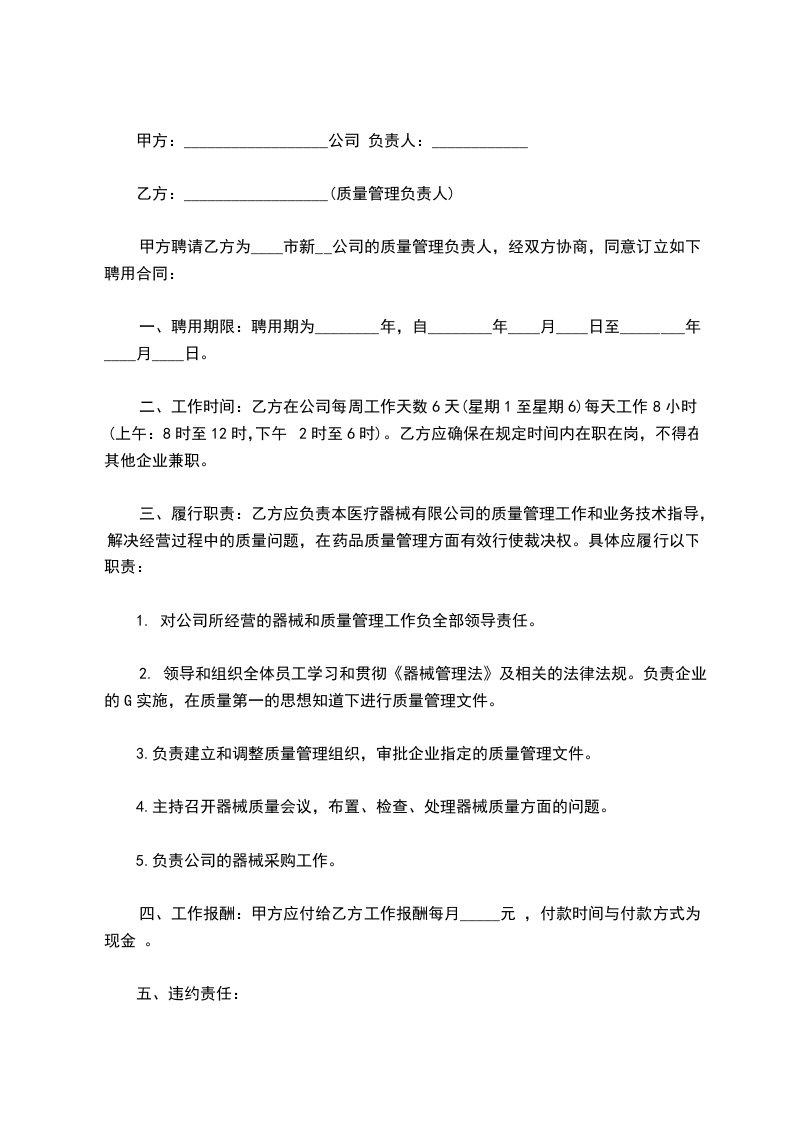 三、履行职责:乙方应负责本医疗器械有限公司的质量管理工作和业务技术指导,解决经营过程中的质量问题,在医疗器械质量管理方面有效行使裁决权,承担相应的质量管理责任。