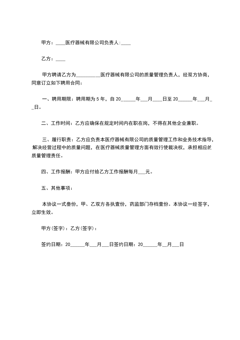 甲方聘请乙方为__________医疗器械有限公司的质量管理负责人,经双方协商,同意订立如下聘用合同: