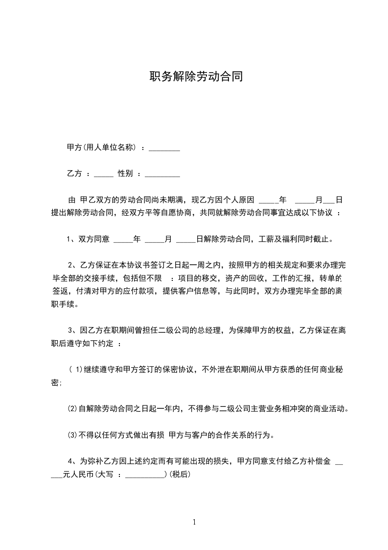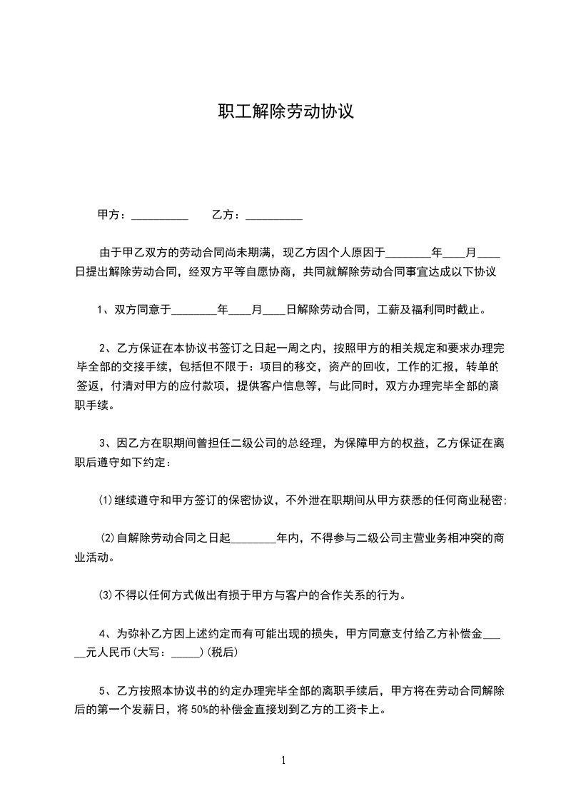 甲、乙双方于____年__月__日签订了有/无固定期限劳动合同,现由____方提出协商解除劳动合同要求,经甲、乙双方协商一致,同意解除劳动合同,并达成如下协议: