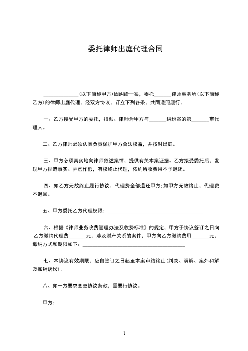__________________(以下简称甲方)因纠纷一案,委托____________律师事务所(以下简称乙方)的律师出庭代理。