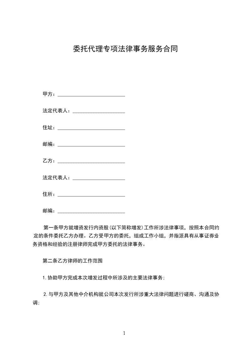 第一条甲方就增资发行内资股(以下简称增发)工作所涉法律事项,按照本合同约定的条件委托乙方办理。乙方受甲方的委托,组成工作小组,并指派具有从事证券业务资格和经验的注册律师完成甲方委托的法律事务。