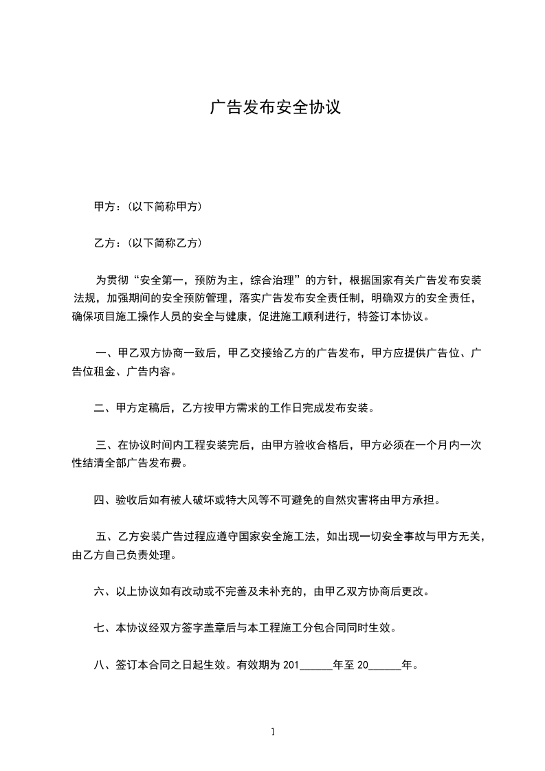 为贯彻“安全第一,预防为主,综合治理”的方针,根据国家有关广告发布安装法规,加强期间的安全预防管理,落实广告发布安全责任制,明确双方的安全责任,确保项目施工操作人员的安全与健康,促进施工顺利进行,特签订本协议。