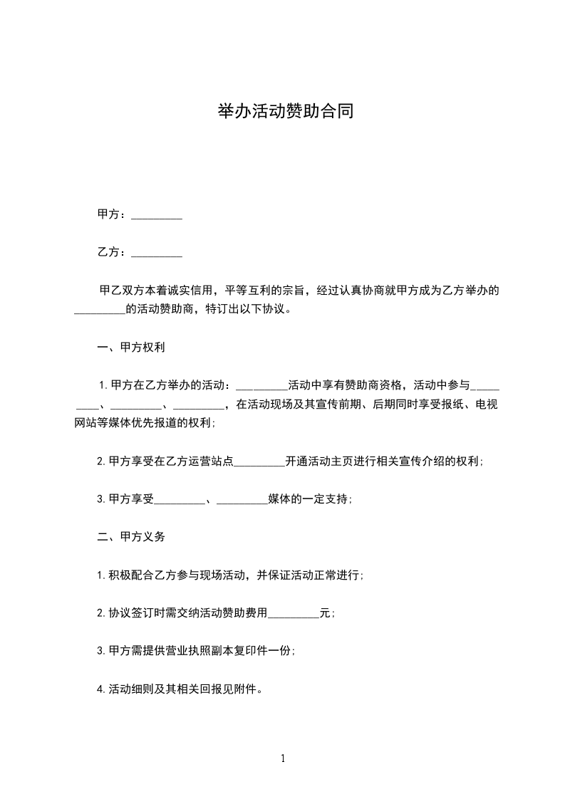 一、经双方友好协商,甲方决定作为乙方举办_________论坛的(按赞助形式之一填写)赞助单位;
