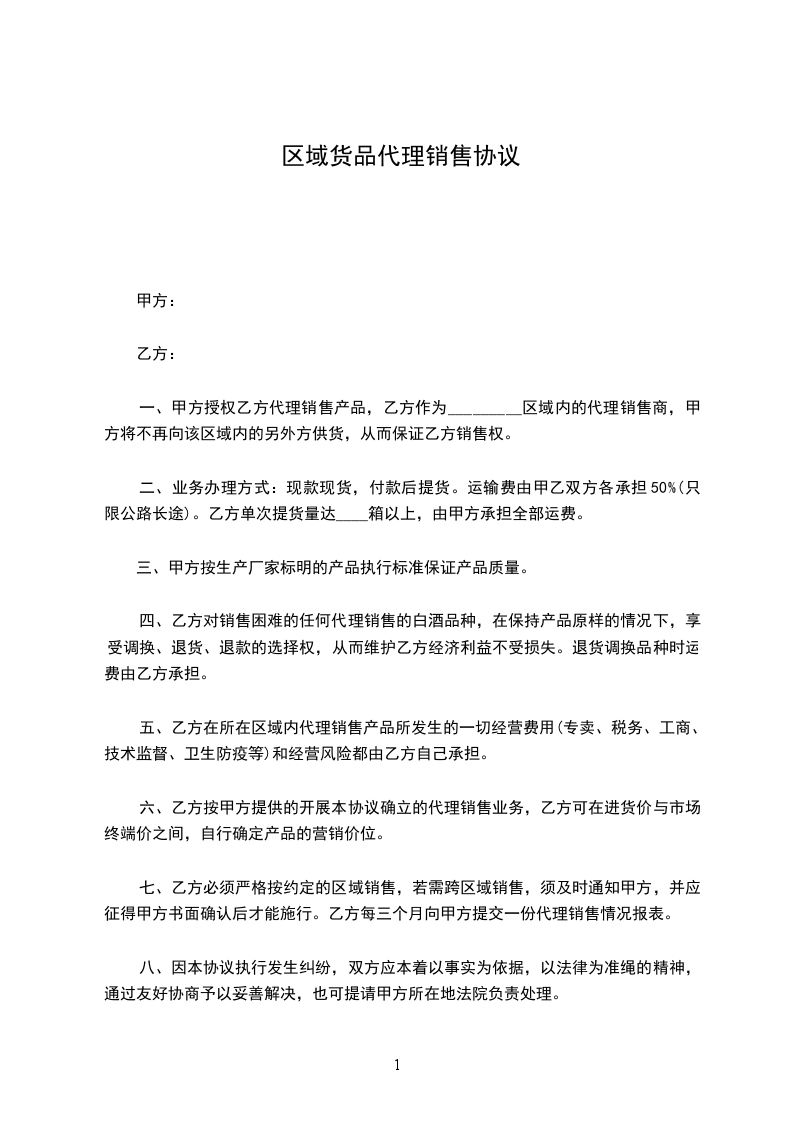 一、甲方授权乙方代理销售产品,乙方作为_________区域内的代理销售商,甲方将不再向该区域内的另外方供货,从而保证乙方销售权。