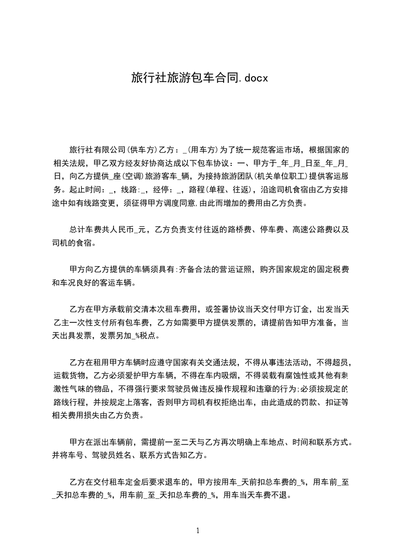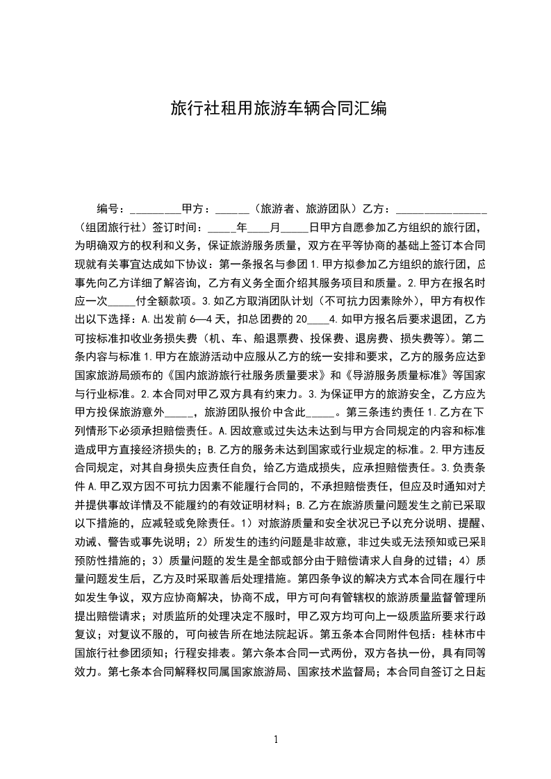 1. 乙方提供给甲方使用的旅游车辆品牌为______,型号为______,车牌号为______,车辆座位数为______座。