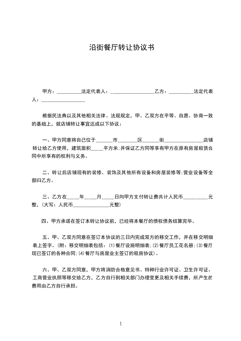 五、甲、乙双方同意在签订本协议的三日内完成双方的移交工作,并在移交明细表上签字。(附:移交明细表包括:(1)餐厅设施明细表;(2)餐厅员工花名册;(3)餐厅现已签订的各种合同;(4)餐厅与房屋业主签订的租房协议)。
