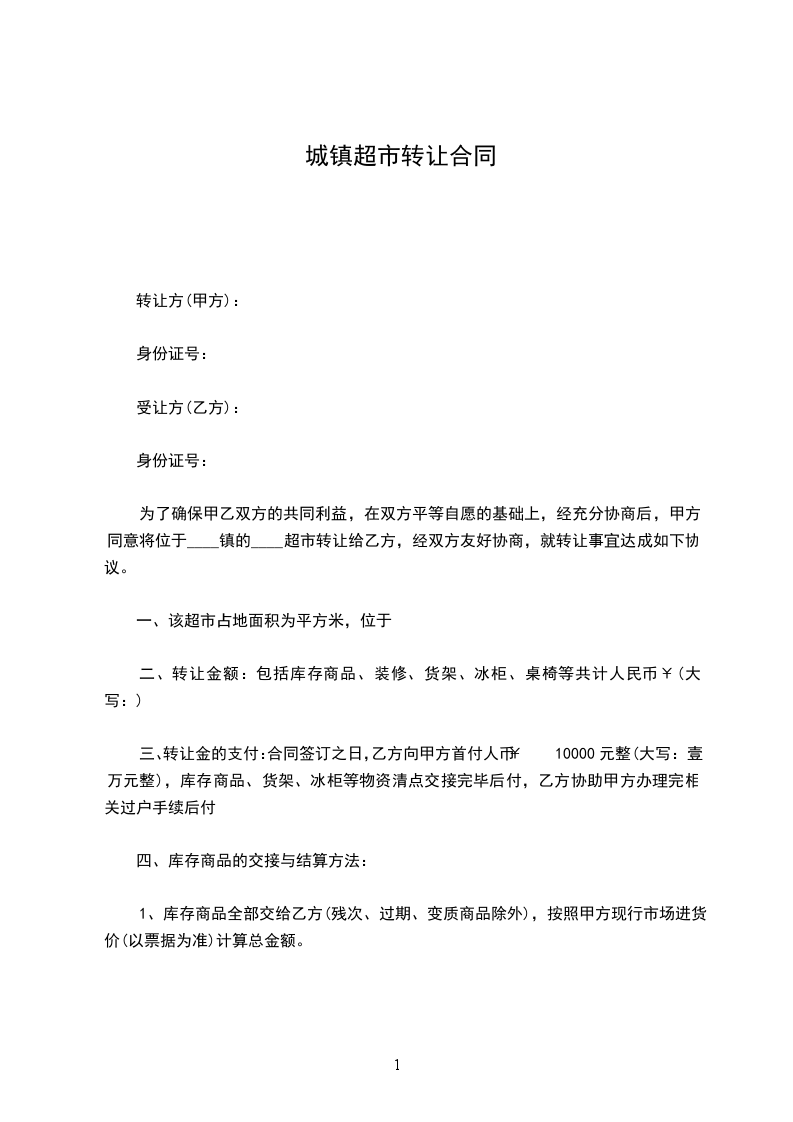 为了确保甲乙双方的共同利益,在双方平等自愿的基础上,经充分协商后,甲方同意将位于____镇的____超市转让给乙方,经双方友好协商,就转让事宜达成如下协议。