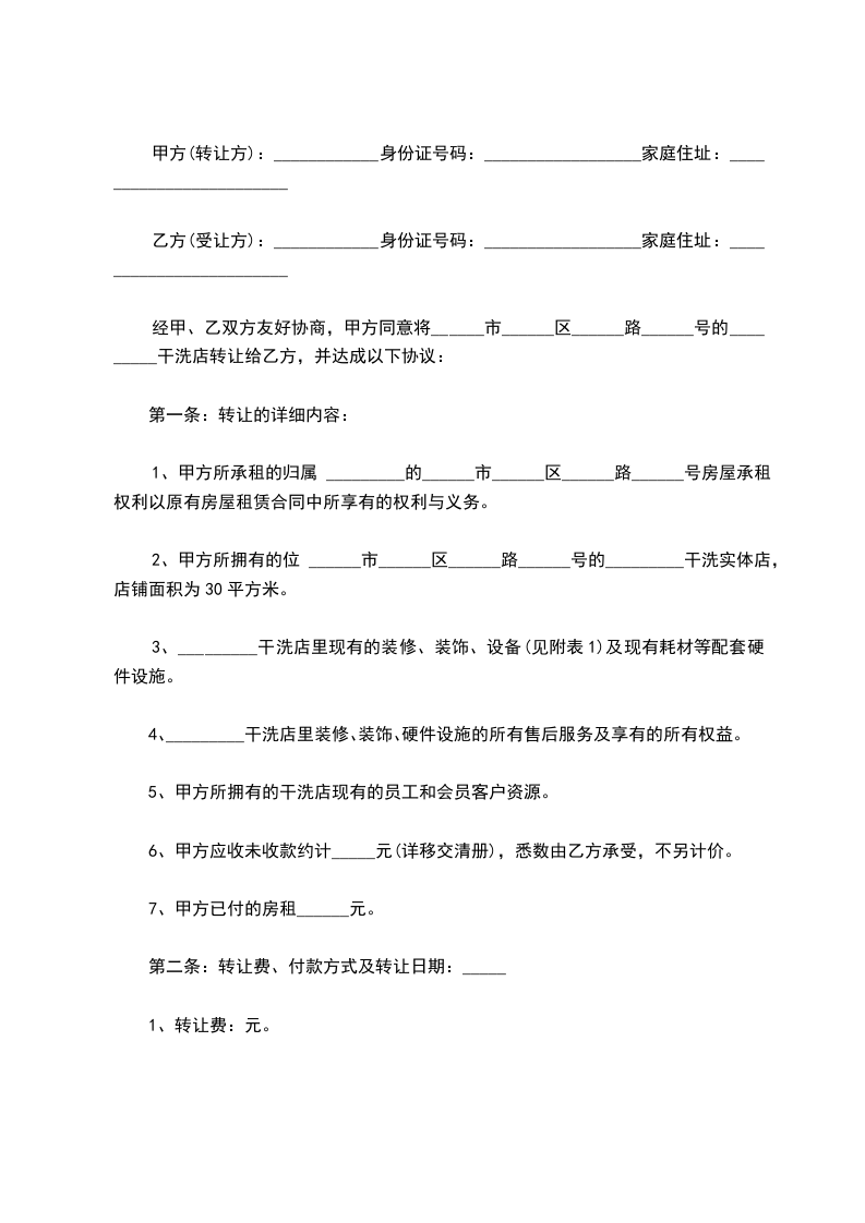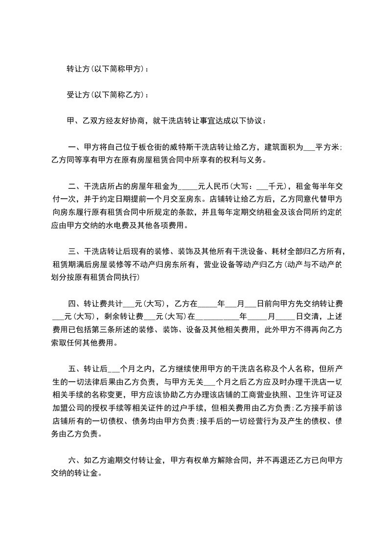 一、甲方将自己位于板仓街的威特斯干洗店转让给乙方,建筑面积为___平方米;乙方同等享有甲方在原有房屋租赁合同中所享有的权利与义务。