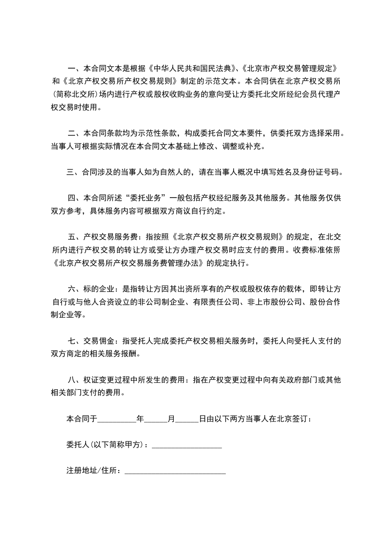 一、本合同文本是根据《中华人民共和国民法典》、《北京市产权交易管理规定》和《北京产权交易所产权交易规则》制定的示范文本。本合同供在北京产权交易所(简称北交所)场内进行产权或股权收购业务的意向受让方委托北交所经纪会员代理产权交易时使用。