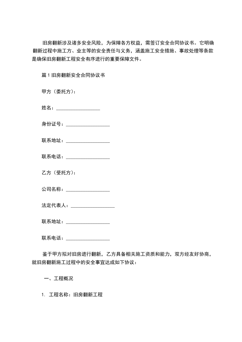 1. 翻新内容:对甲方位于__________________的旧房子进行全面翻新,具体翻新项目包括但不限于房屋结构改造、墙面地面装修、水电线路改造、门窗更换、厨卫设施更新等,详细翻新内容以双方确认的设计图纸及工程预算为准。