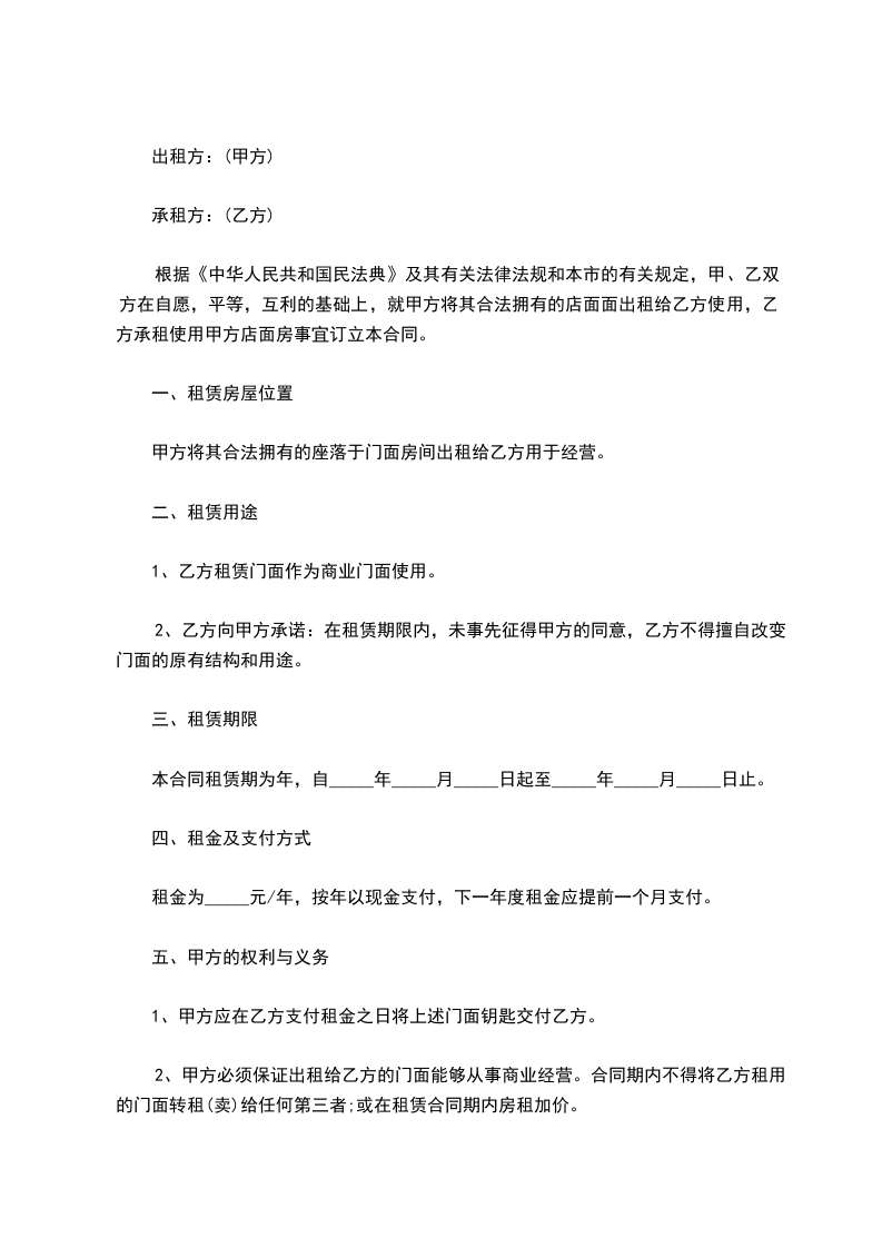 根据《中华人民共和国民法典》及其有关法律法规和本市的有关规定,甲、乙双方在自愿,平等,互利的基础上,就甲方将其合法拥有的店面面出租给乙方使用,乙方承租使用甲方店面房事宜订立本合同。