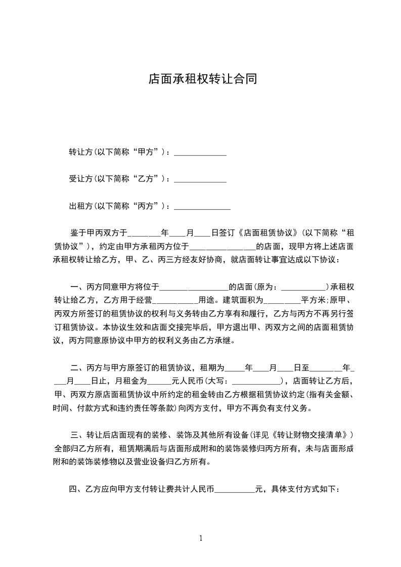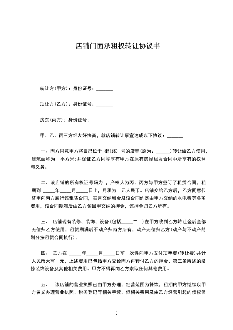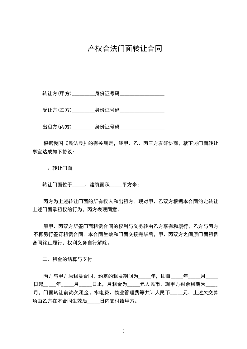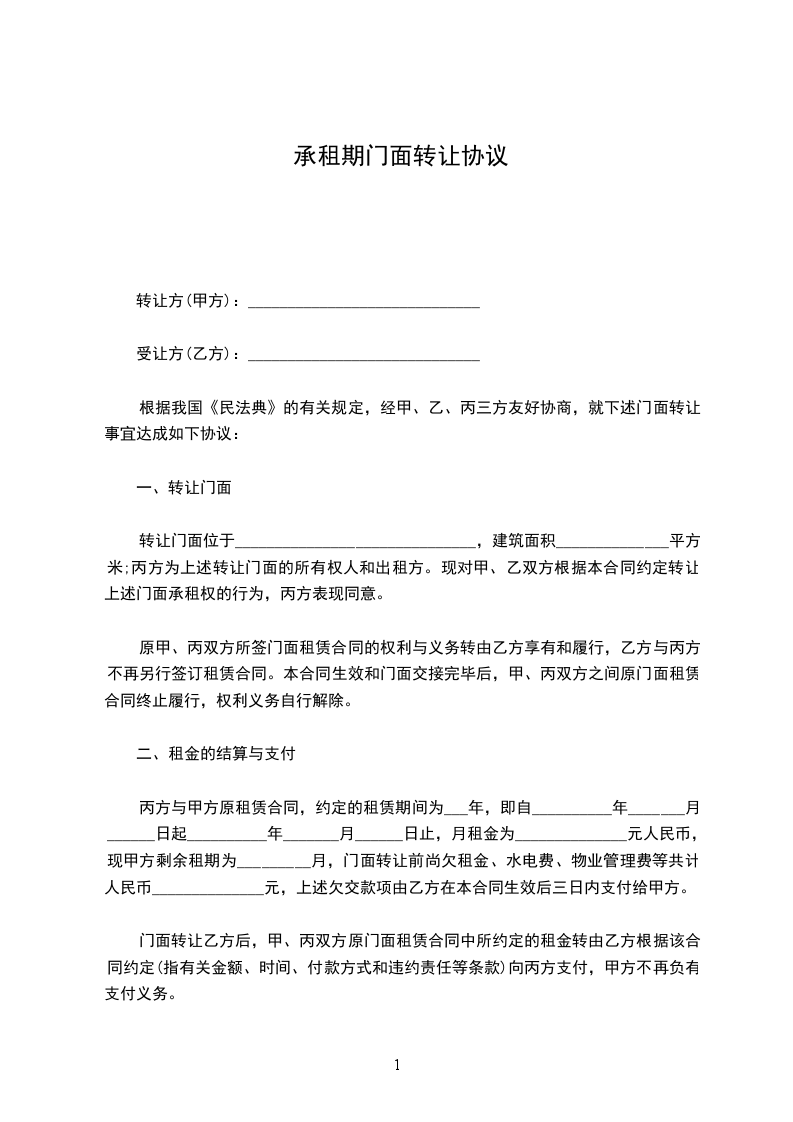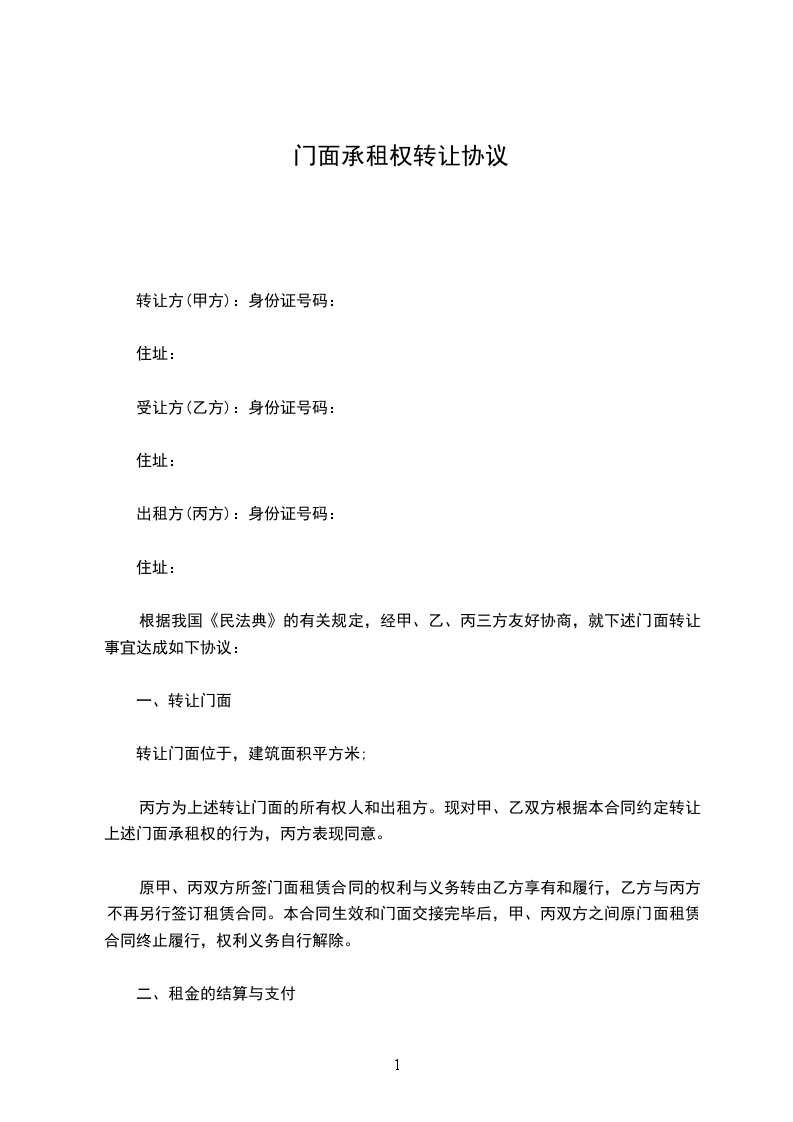 根据我国《民法典》的有关规定,经甲、乙、丙三方友好协商,就下述门面转让事宜达成如下协议: