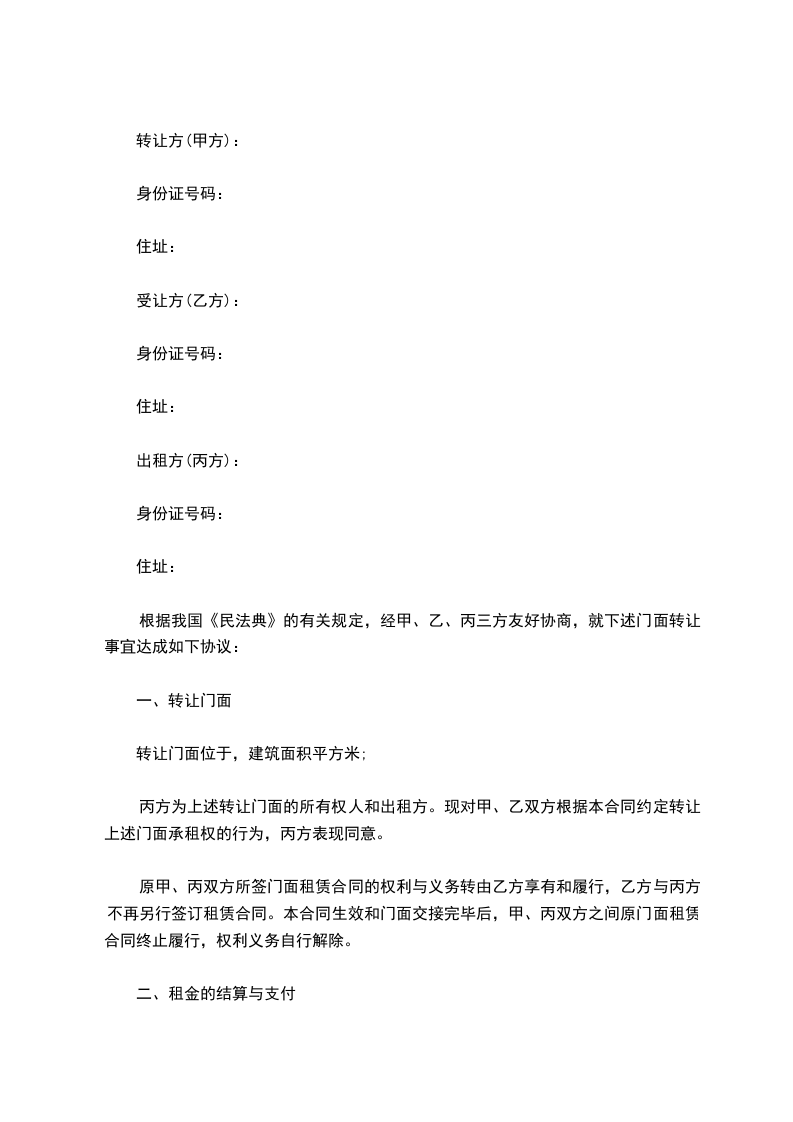 根据我国《民法典》的有关规定,经甲、乙、丙三方友好协商,就下述门面转让事宜达成如下协议: