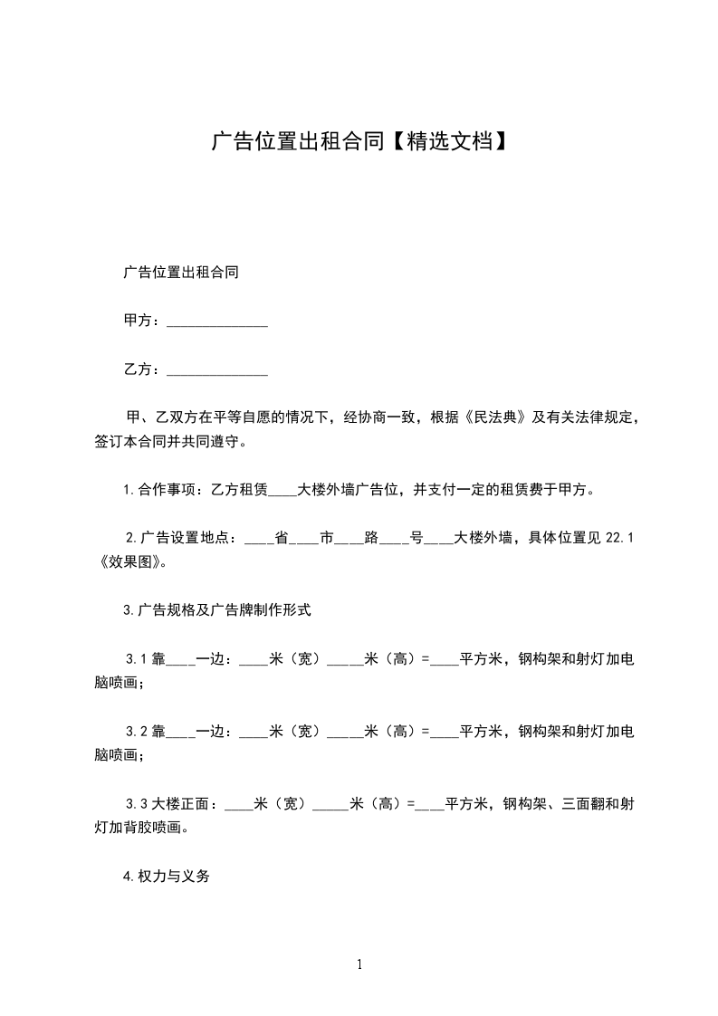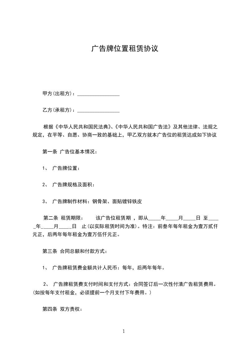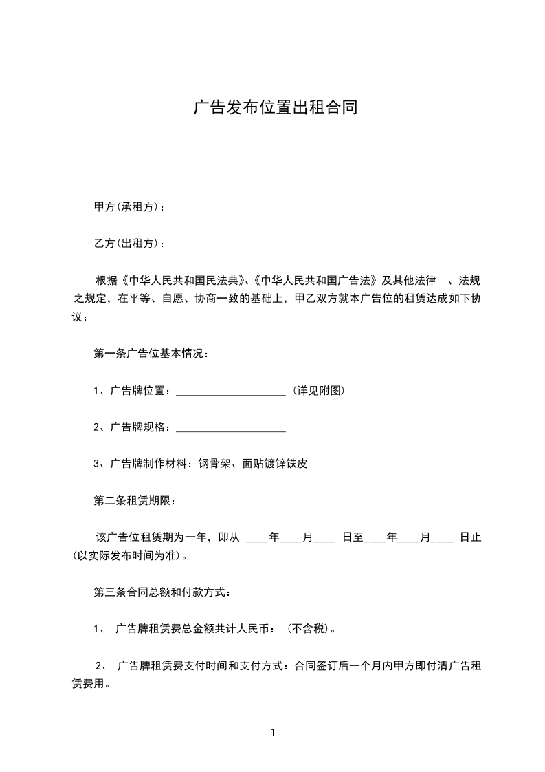 根据《中华人民共和国民法典》、《中华人民共和国广告法》及其他法律、法规之规定,在平等、自愿、协商一致的基础上,甲乙双方就本租赁达成如下协议: