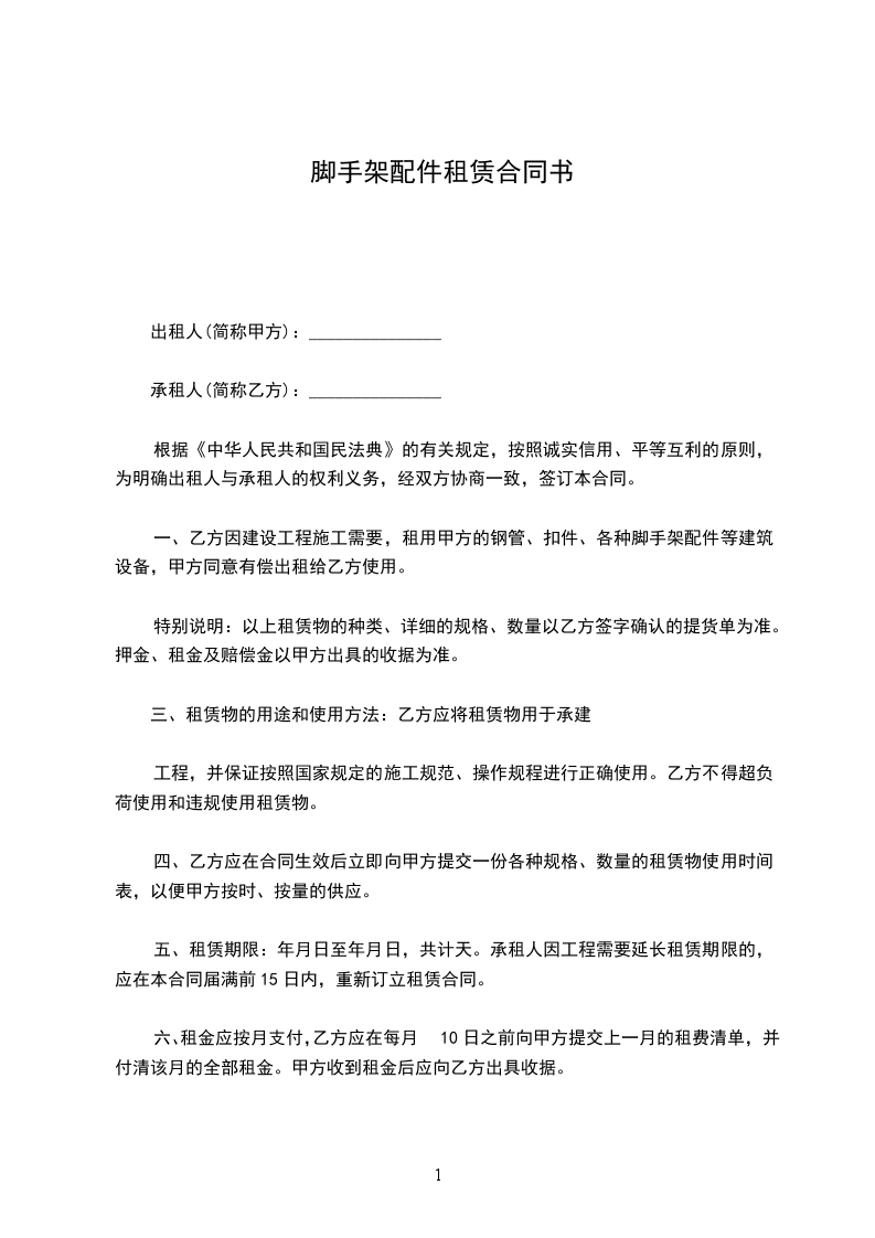 一、乙方因建设工程施工需要,租用甲方的钢管、扣件、各种脚手架配件等建筑设备,甲方同意有偿出租给乙方使用。