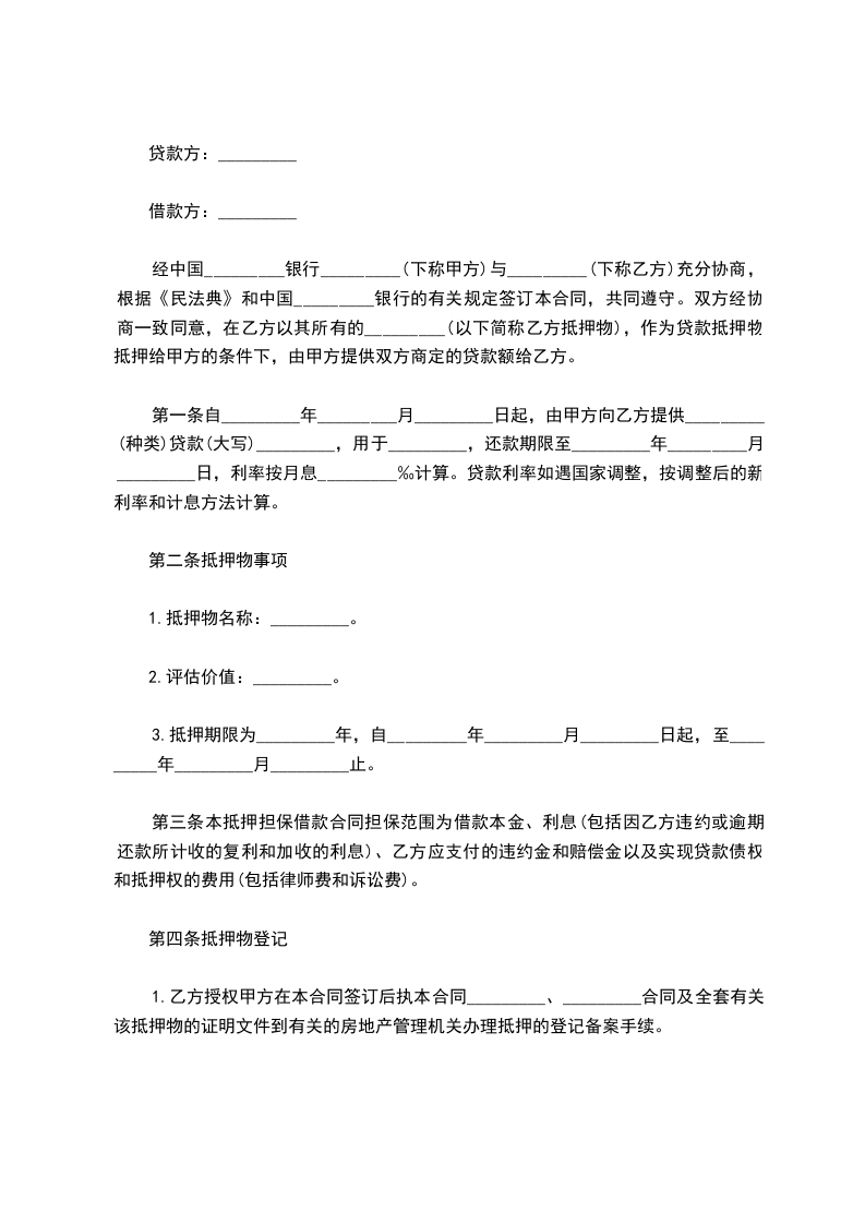经中国_________银行_________(下称甲方)与_________(下称乙方)充分协商,根据《民法典》和中国_________银行的有关规定签订本合同,共同遵守。双方经协商一致同意,在乙方以其所有的_________(以下简称乙方抵押物),作为贷款抵押物抵押给甲方的条件下,由甲方提供双方商定的贷款额给乙方。