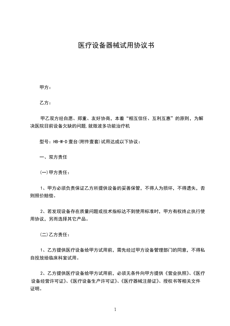 1、乙方提供医疗设备给甲方试用前,需先经过甲方设备管理部门的同意,不得私自投放给临床科室试用。