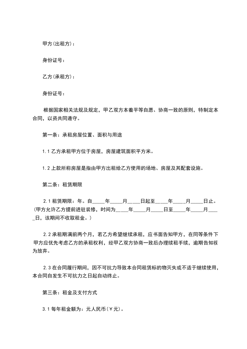2.1租赁期限:年。自_____年_____月_____日起至_____年_____月_____日止。(甲方允许乙方提前进驻装修,时间为_____年_____月_____日至_____年_____月_____日,该期间不收取租金。)