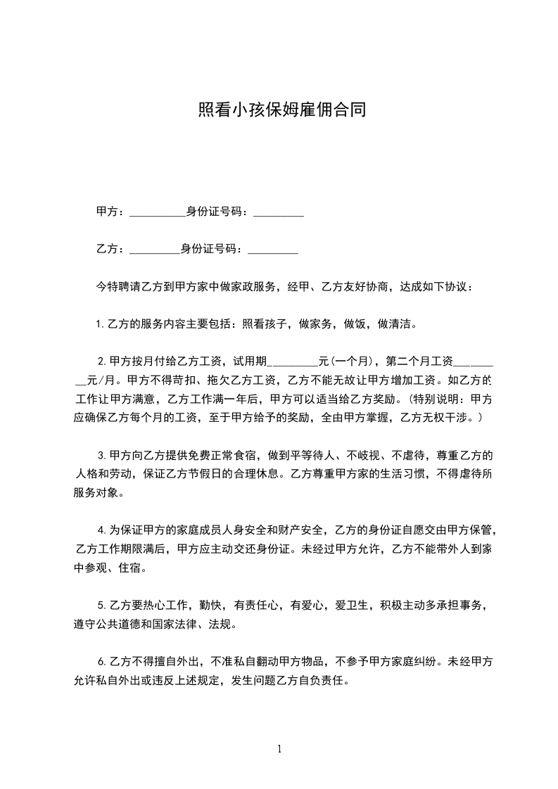 鉴于甲方需要雇佣保姆照顾孩子,乙方愿意接受甲方的雇佣,经双方友好协商,达成以下协议: