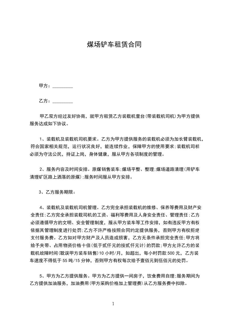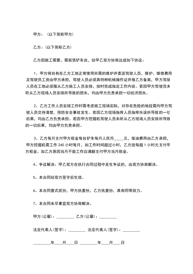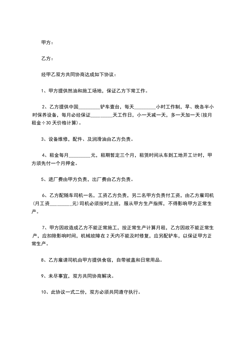 2、乙方提供中国_________铲车壹台,每天_________小时工作制,早、晚各半小时保养设备,每月必经保证_________天工作日,小一天减一天,多一天加一天(按月租金÷30天价格计算)。