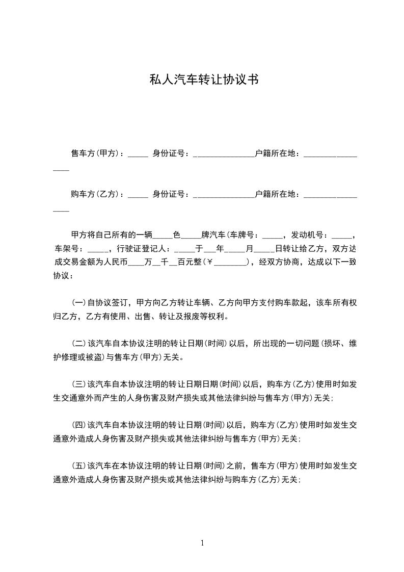 (五)该汽车在本协议注明的转让日期(时间)之前,售车方(甲方)使用时如发生交通意外造成人身伤害及财产损失或其他法律纠纷与购车方(乙方)无关;