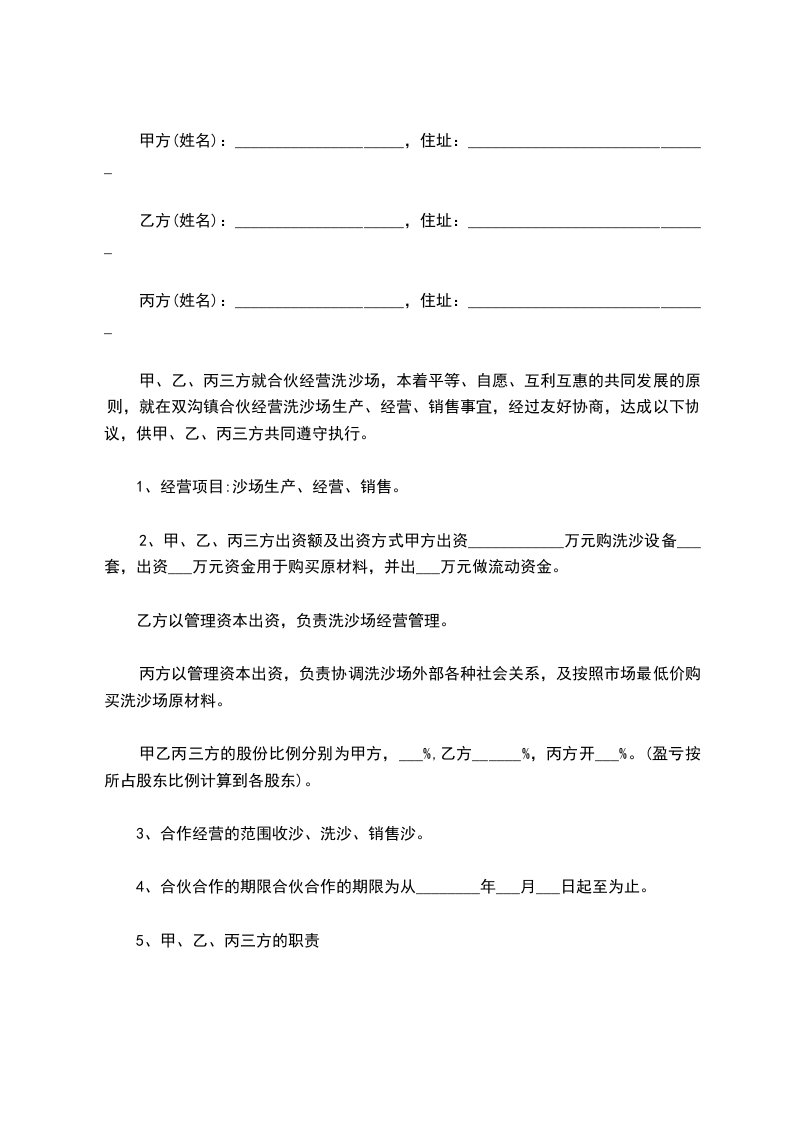 甲、乙、丙三方就合伙经营洗沙场,本着平等、自愿、互利互惠的共同发展的原则,就在双沟镇合伙经营洗沙场生产、经营、销售事宜,经过友好协商,达成以下协议,供甲、乙、丙三方共同遵守执行。