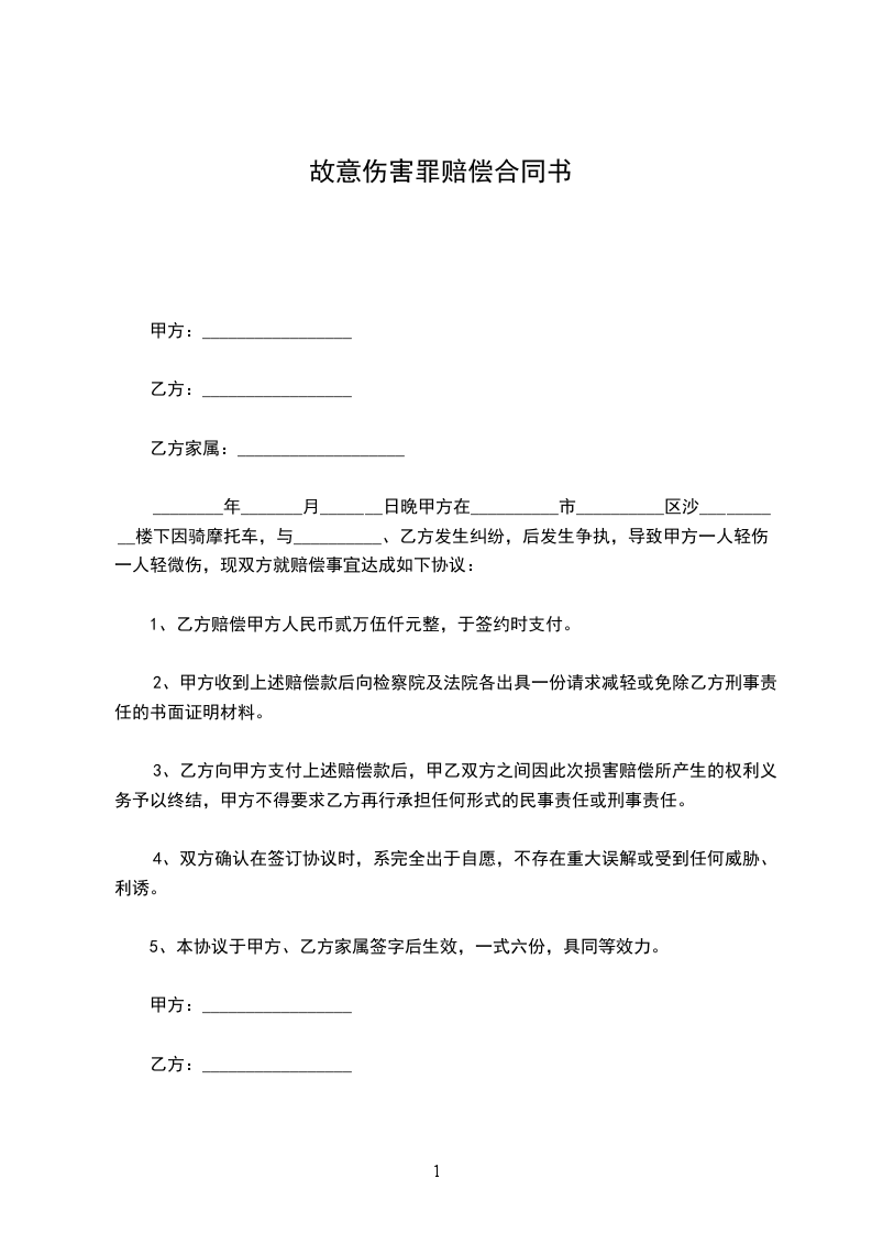 ________年_______月_______日晚甲方在__________市__________区沙__________楼下因骑摩托车,与__________、乙方发生纠纷,后发生争执,导致甲方一人轻伤、一人轻微伤,现双方就赔偿事宜达成如下协议: