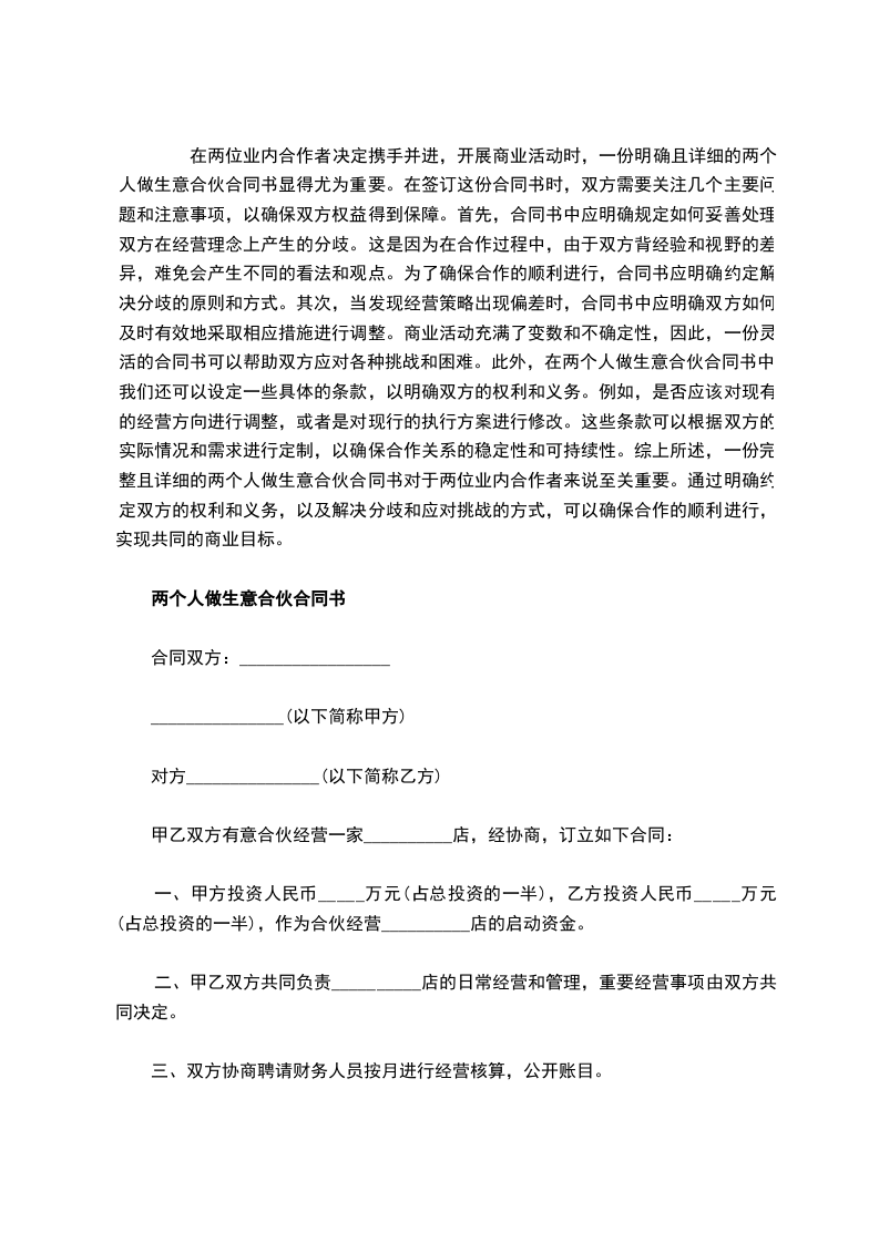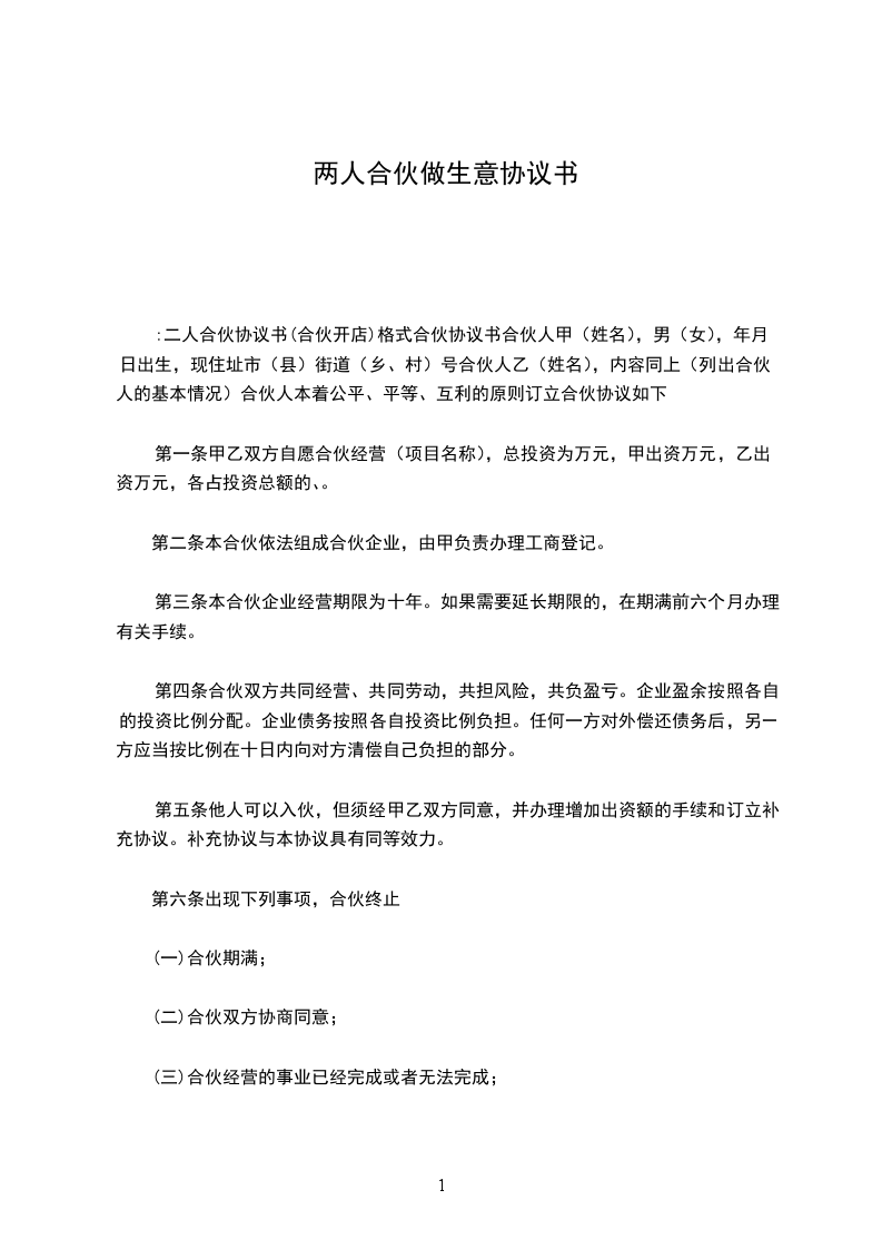 鉴于合伙人 1 和合伙人 2 有意共同合伙经营[具体业务名称],经友好协商,双方达成以下合伙协议: