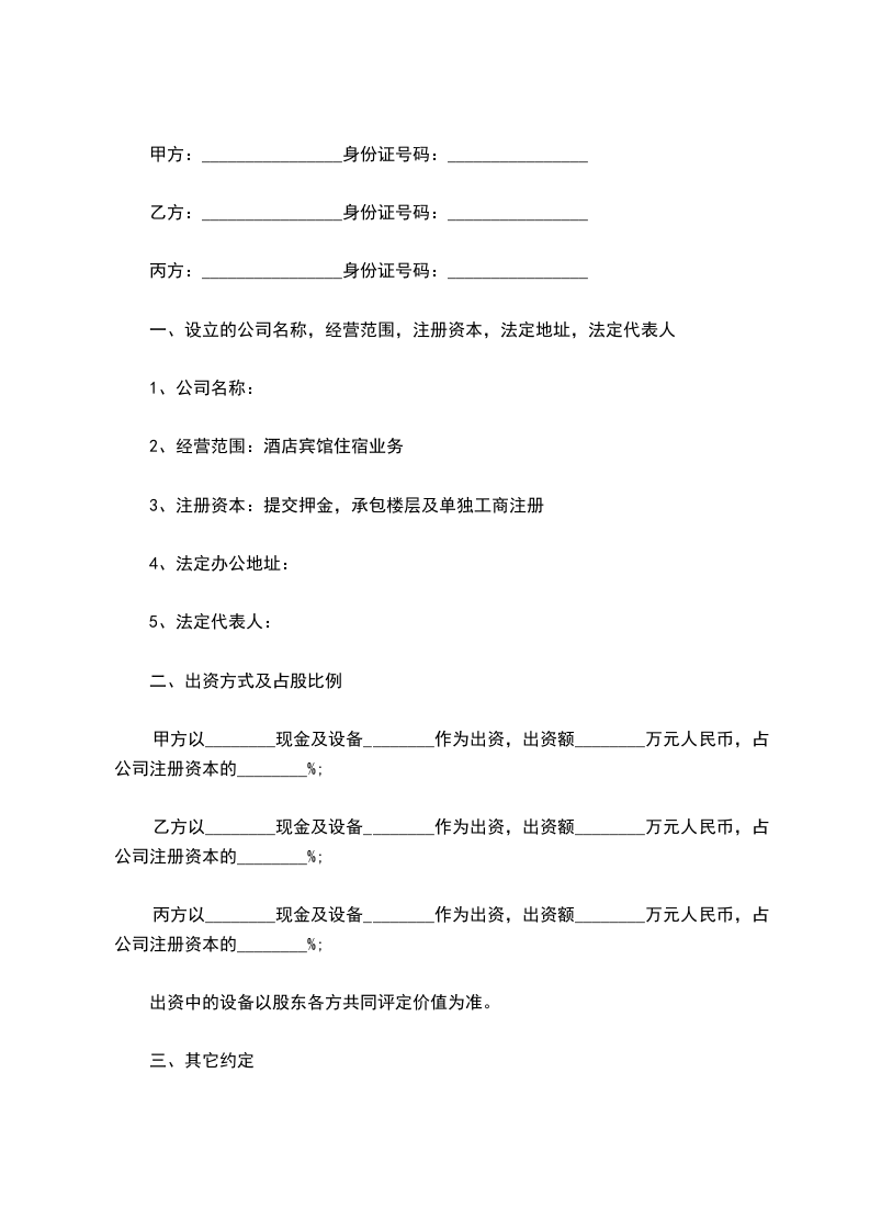 丙方以________现金及设备________作为出资,出资额________万元人民币,占公司注册资本的________%;