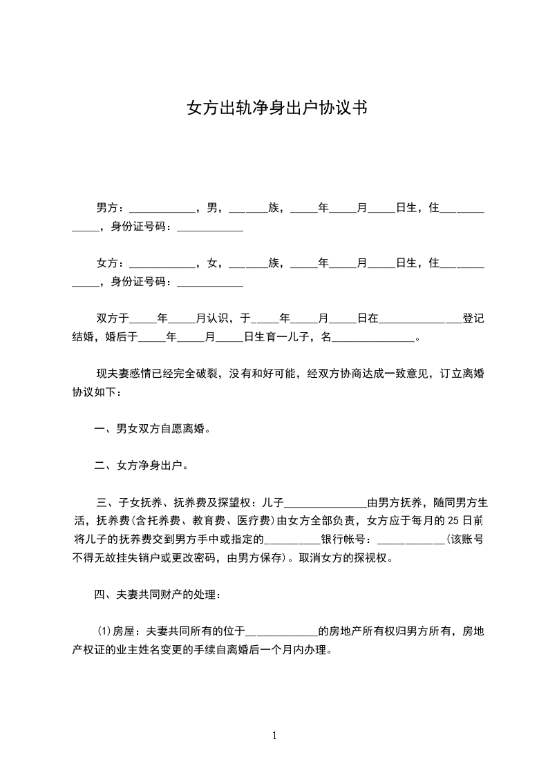 (3)由于女方在婚姻关系过程中存在过错,因此双方在协商一致的情况下,女方净身出户。