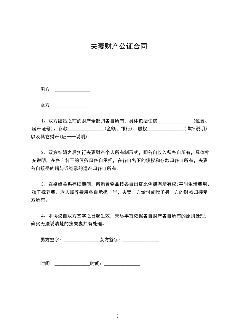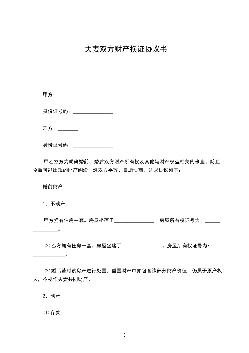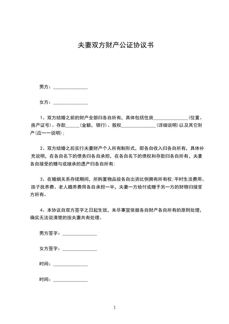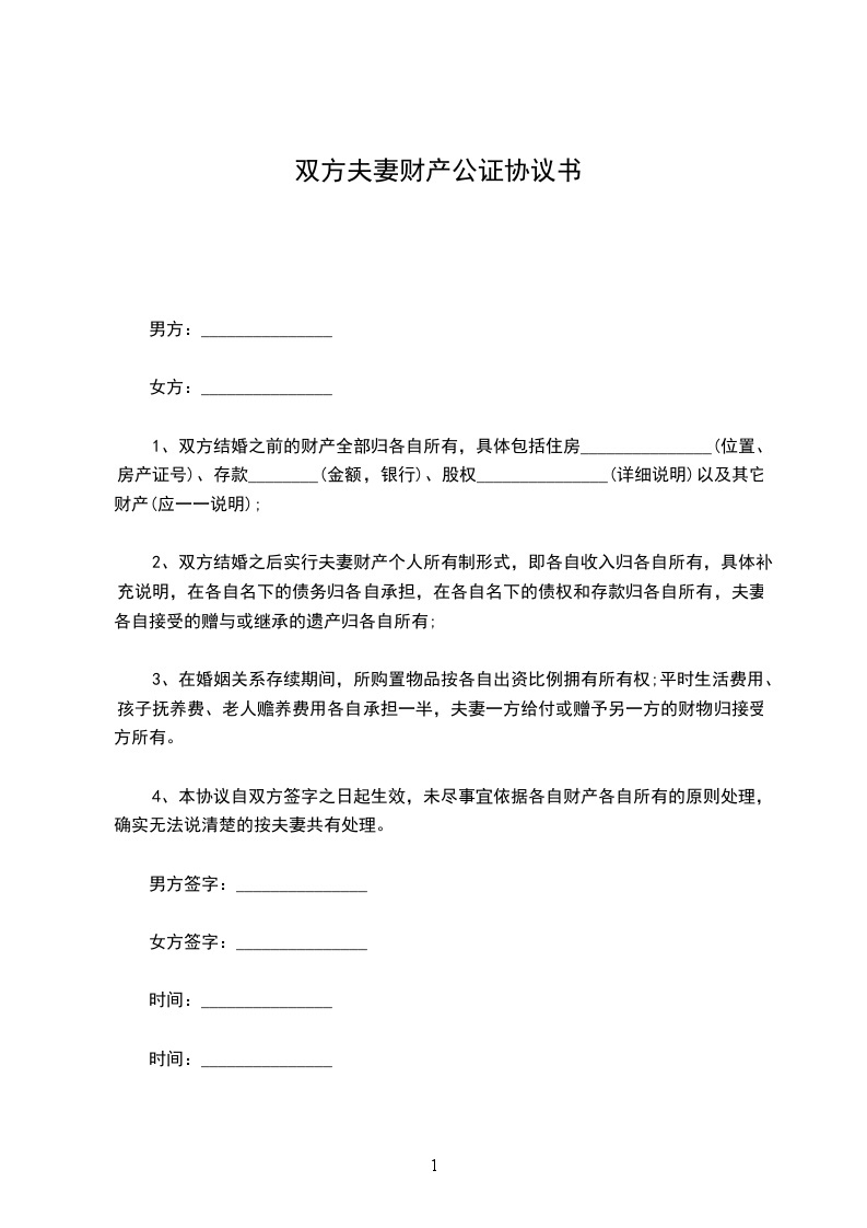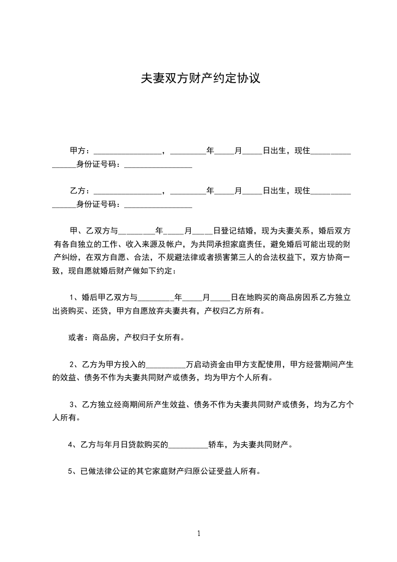 1、双方结婚之前的财产全部归各自所有,具体包括住房_______________(位置、房产证号)、存款________(金额,银行)、股权_______________(详细说明)以及其它财产(应一一说明);