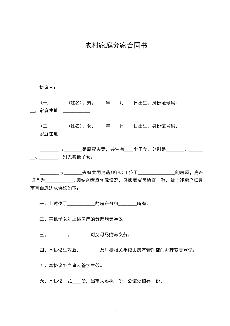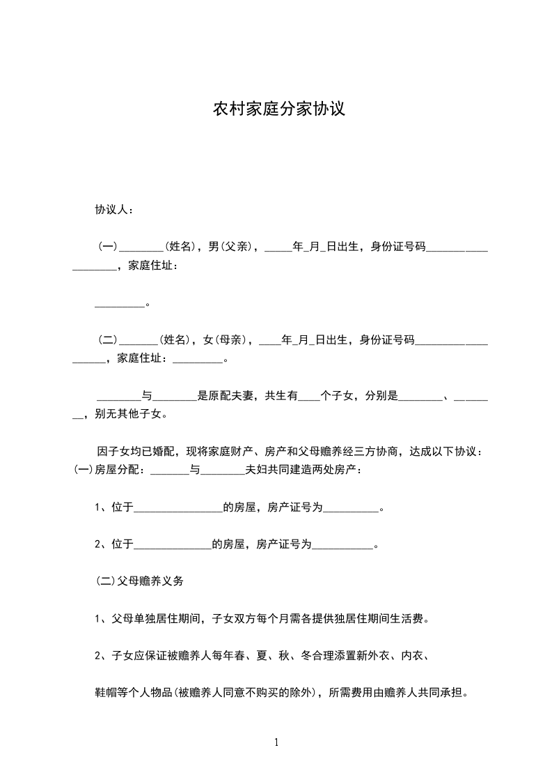 农村家庭分户协议